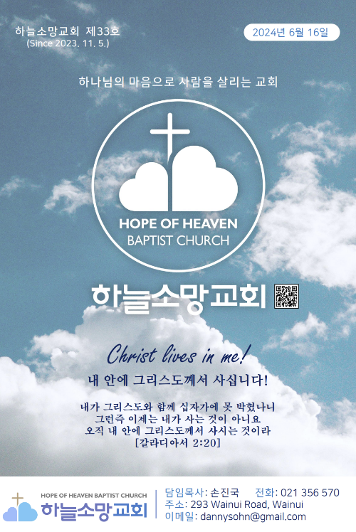 2024년 6월 16일 주보 2024년 6월 16일하늘소망교회 제 33호 주보 하늘소망교회(담임 손진국 목사)는 뉴질랜드 오클랜드 북부 실버데일에 세워진 한인교회로 '하나님의 마음으로 사람을 살리는 교회'입니다. 주보 Bulletin 2024.06.15