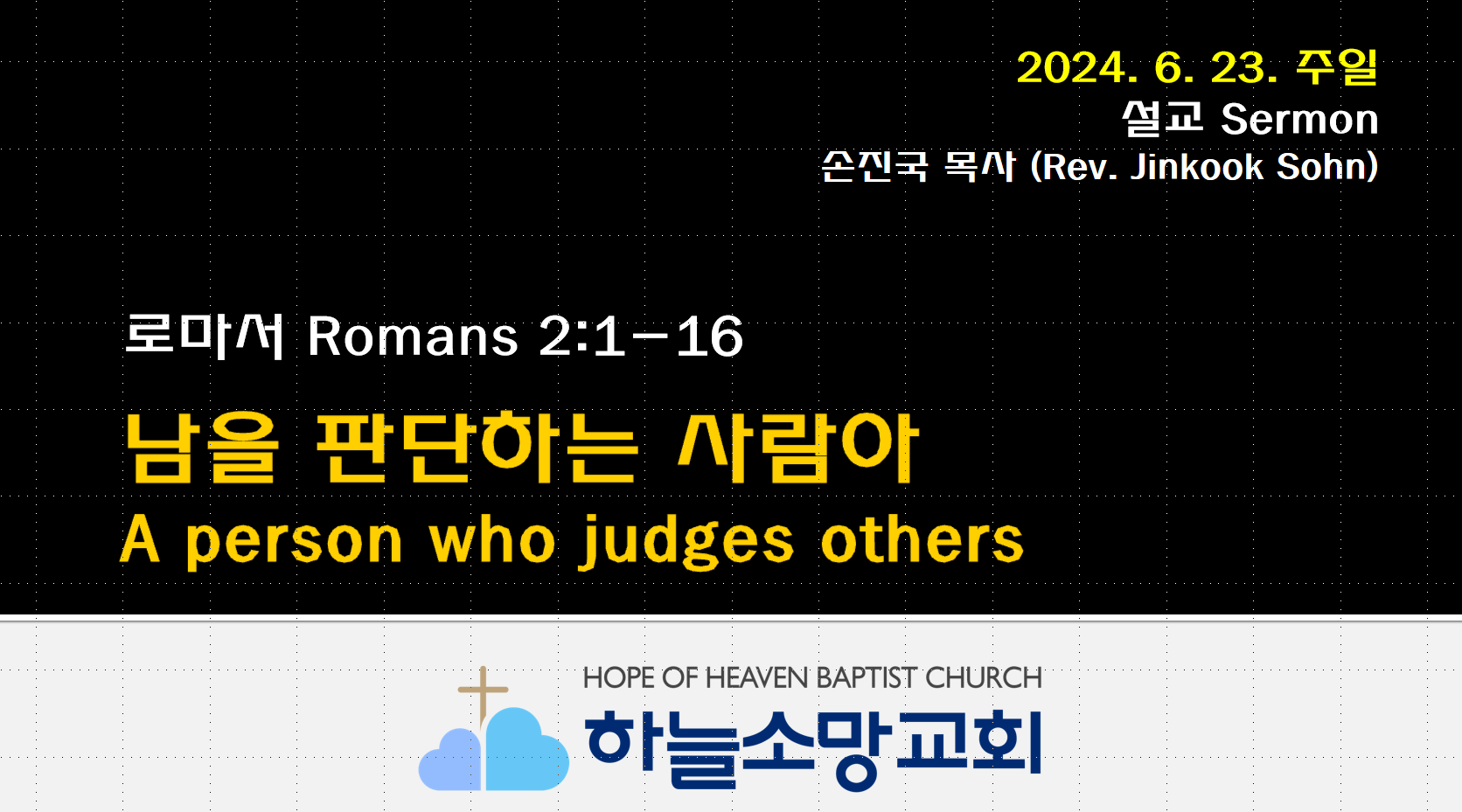 [ 2024. 6. 23.] 남을 판단하는 사람아 | 로마서 2.1-16 2024. 6. 23. 주일예배 설교-로마서 강해 4 본문: 로마서 2:1-16제목: 남을 판단하는 사람아 설교자: 손진국 목사 [롬 2:1-16] 1 그러므로 남을 판단하는 사람아, 누구를 막론하고 네가 핑계하지 못할 것은 남을 판단하는 것으로 네가 너를 정죄함이니 판단하는 네가 같은 일을 행함이니라2 이런 일을 행하는 자에게 하나님의 심판이 진리대로 되는 줄 우리가 아노라3 이런 일을 행하는 자를 판단하고도 같은 일을 행하는 사람아, 네가 하나님의 심판을 피할 줄로 생각하느냐4 혹 네가 하나님의 인자하심이 너를 인도하여 회개하게 하심을 알지 못하여 그의 인자하심과 용납하심과 길이 참으심이 풍성함을 멸시하느냐5 ..