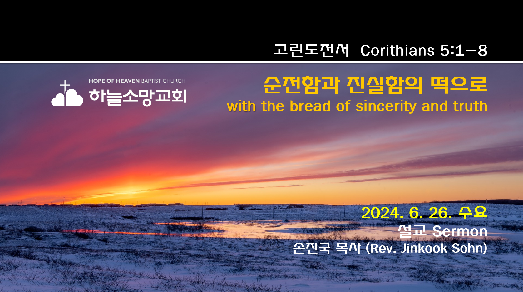 2024. 6. 26. 수요예배 고린도전서 강해-11 본문: 고린도전서 5:1-8제목: 순전함과 진실함의 떡으로설교자: 손진국 목사 [고전 5:1-8]1 너희 중에 심지어 음행이 있다 함을 들으니 그런 음행은 이방인 중에서도 없는 것이라 누가 그 아버지의 아내를 취하였다 하는도다2 그리하고도 너희가 오히려 교만하여져서 어찌하여 통한히 여기지 아니하고 그 일 행한 자를 너희 중에서 쫓아내지 아니하였느냐3 내가 실로 몸으로는 떠나 있으나 영으로는 함께 있어서 거기 있는 것 같이 이런 일 행한 자를 이미 판단하였노라4 주 예수의 이름으로 너희가 내 영과 함께 모여서 우리 주 예수의 능력으로5 이런 자를 사탄에게 내주었으니 이는 육신은 멸하고 영은 1)주 예수의 날에 구원을 받게 하려 함이라6..