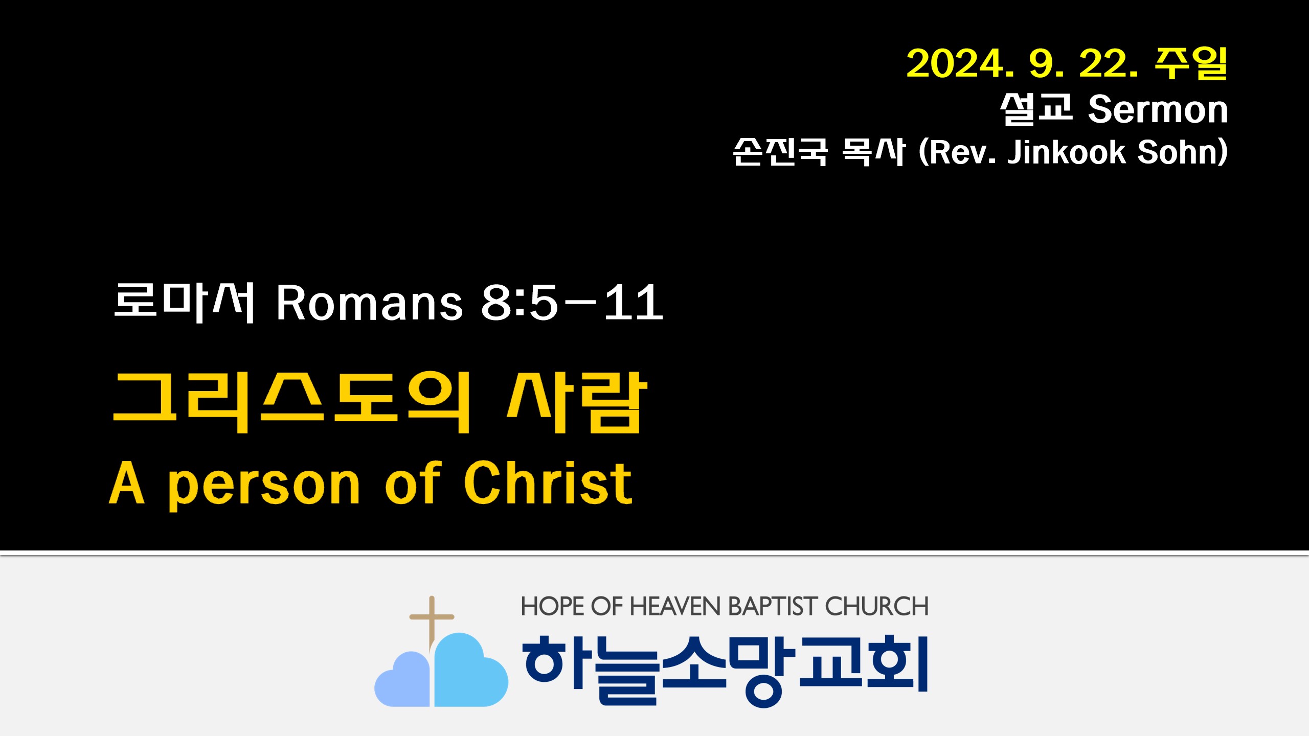 2024. 9. 22. 하늘소망교회 주일예배 동영상본문: 로마서 8:5-11제목: 그리스도의 사람설교자: 손진국 목사 [롬 8:5-11]5 육신을 따르는 자는 육신의 일을, 영을 따르는 자는 영의 일을 생각하나니6 육신의 생각은 사망이요 영의 생각은 생명과 평안이니라7 육신의 생각은 하나님과 원수가 되나니 이는 하나님의 법에 굴복하지 아니할 뿐 아니라 할 수도 없음이라8 육신에 있는 자들은 하나님을 기쁘시게 할 수 없느니라9 만일 너희 속에 하나님의 영이 거하시면 너희가 육신에 있지 아니하고 영에 있나니 누구든지 그리스도의 영이 없으면 그리스도의 사람이 아니라10 또 그리스도께서 너희 안에 계시면 몸은 죄로 말미암아 죽은 것이나 영은 의로 말미암아 살아 있는 것이니라11 예수..