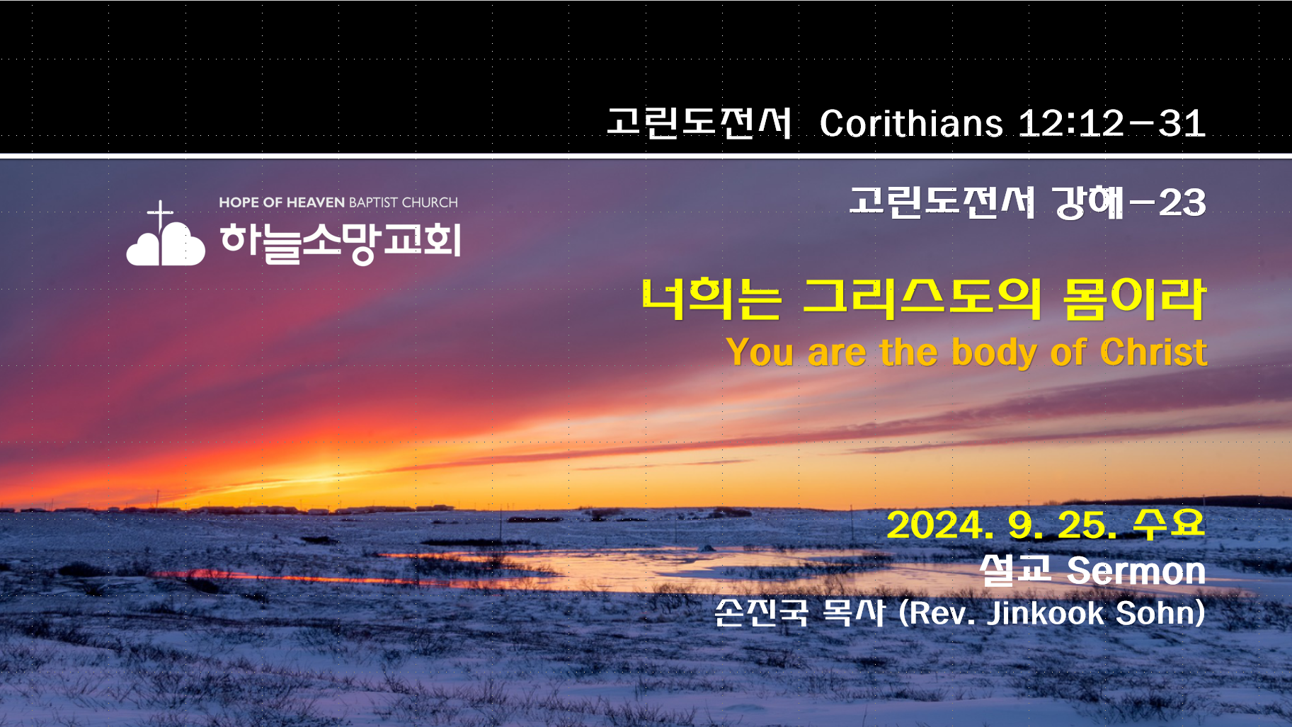 2024. 9. 25. 수요예배 고린도전서 강해-23 본문: 고린도전서 12:12-31제목: 너희는 그리스도의 몸이라설교자: 손진국 목사 [설교 mp3 파일] [고전 12:12-31]12 몸은 하나인데 많은 지체가 있고 몸의 지체가 많으나 한 몸임과 같이 그리스도도 그러하니라13 우리가 유대인이나 헬라인이나 종이나 자유인이나 다 한 성령으로 침례를 받아 한 몸이 되었고 또 다 한 성령을 마시게 하셨느니라14 몸은 한 지체뿐만 아니요 여럿이니15 만일 발이 이르되 나는 손이 아니니 몸에 붙지 아니하였다 할지라도 이로써 몸에 붙지 아니한 것이 아니요16 또 귀가 이르되 나는 눈이 아니니 몸에 붙지 아니하였다 할지라도 이로써 몸에 붙지 아니한 것이 아니니17 만일 온 몸이 눈이면 듣는 ..