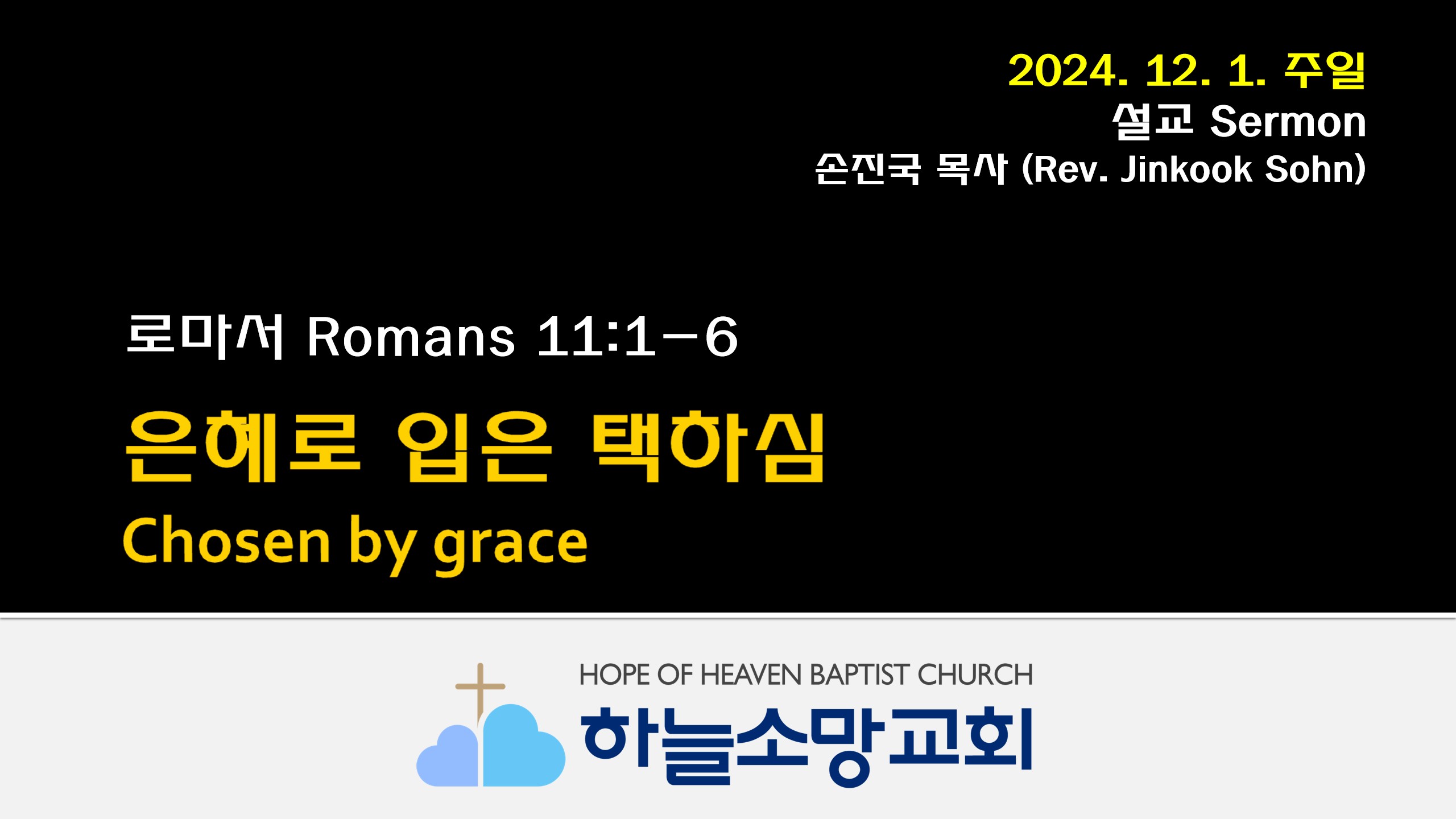 2024. 12. 1. 하늘소망교회 주일예배 동영상본문: 로마서 11:1-6제목: 은혜로 입은 택하심설교자: 손진국 목사 [롬 11:1-6]1 그러므로 내가 말하노니 하나님이 자기 백성을 버리셨느냐 그럴 수 없느니라 나도 이스라엘인이요 아브라함의 씨에서 난 자요 베냐민 지파라2 하나님이 그 미리 아신 자기 백성을 버리지 아니하셨나니 너희가 성경이 엘리야를 가리켜 말한 것을 알지 못하느냐 그가 이스라엘을 하나님께 고발하되3 ㄱ)주여 그들이 주의 선지자들을 죽였으며 주의 제단들을 헐어 버렸고 나만 남았는데 내 목숨도 찾나이다 하니4 그에게 하신 대답이 무엇이냐 내가 나를 위하여 바알에게 무릎을 꿇지 아니한 사람 칠천 명을 남겨 두었다 하셨으니5 그런즉 이와 같이 지금도 은혜로 택하심을 따..
