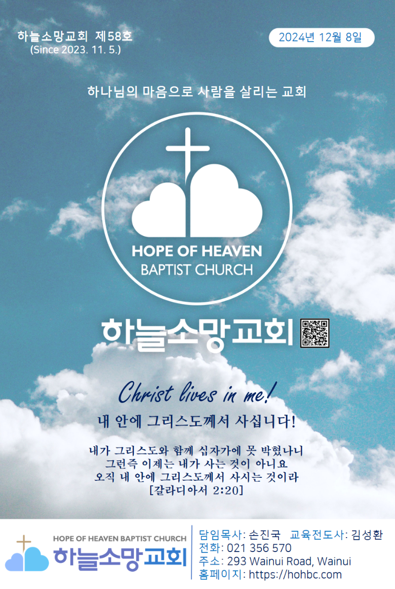 2024년 12월 8일 주보 (제 58호) 2024년 12월 8일하늘소망교회 제 58호 주보 Hope of Heaven Baptist Church 하늘소망교회(담임 손진국 목사)는 뉴질랜드 오클랜드 북부 실버데일에 세워진 한인교회로 '하나님의 마음으로 사람을 살리는 교회'입니다.