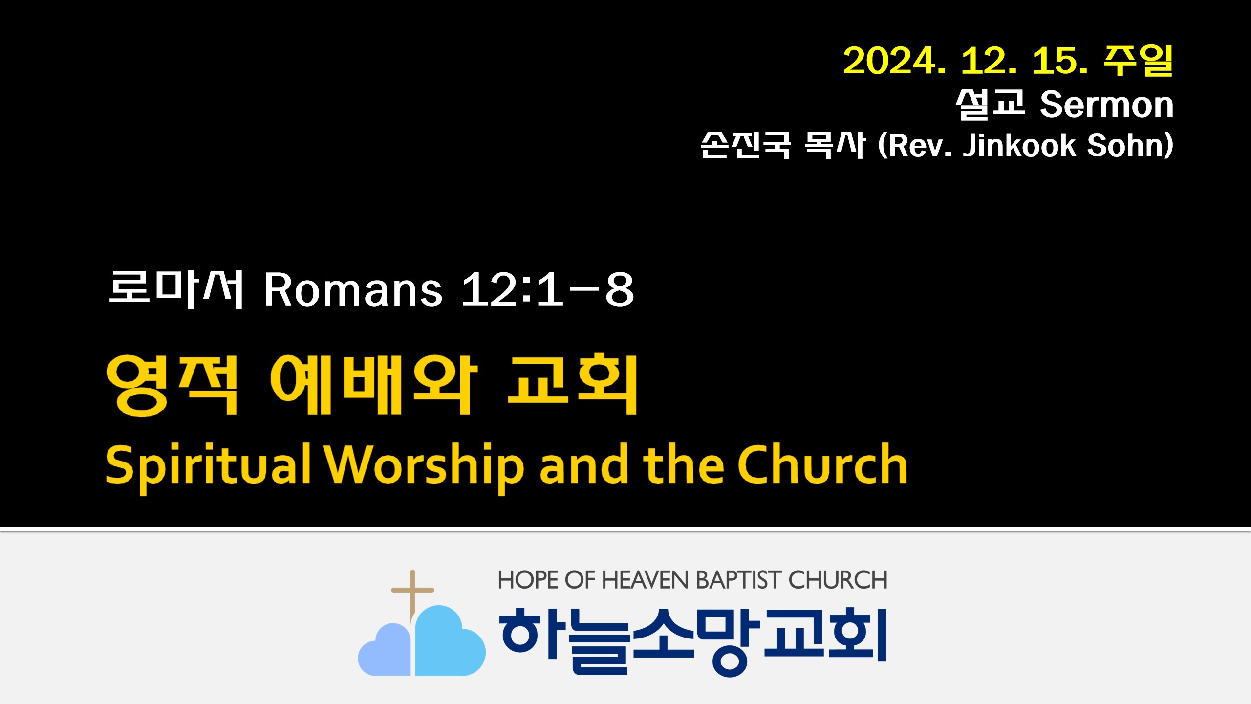 [ 2024. 12. 15.] (로마서 강해 27) 영적 예배와 교회  | 로마서 12:1-8  https://youtu.be/0e0E1mhTXYk 2024. 12. 15.  주일예배 설교- 로마서 강해 27본문: 로마서 12:1-8 제목: 영적 예배와 교회 설교자: 손진국 목사 [롬 12:1-8]1   그러므로 형제들아 내가 하나님의 모든 자비하심으로 너희를 권하노니 너희 몸을 하나님이 기뻐하시는 거룩한 산 제물로 드리라 이는 너희가 드릴 영적 예배니라2   너희는 이 세대를 본받지 말고 오직 마음을 새롭게 함으로 변화를 받아 하나님의 선하시고 기뻐하시고 온전하신 뜻이 무엇인지 분별하도록 하라3   내게 주신 은혜로 말미암아 너희 각 사람에게 말하노니 마땅히 생각할 그 이상의 생각을 품지 말고 오직 하..