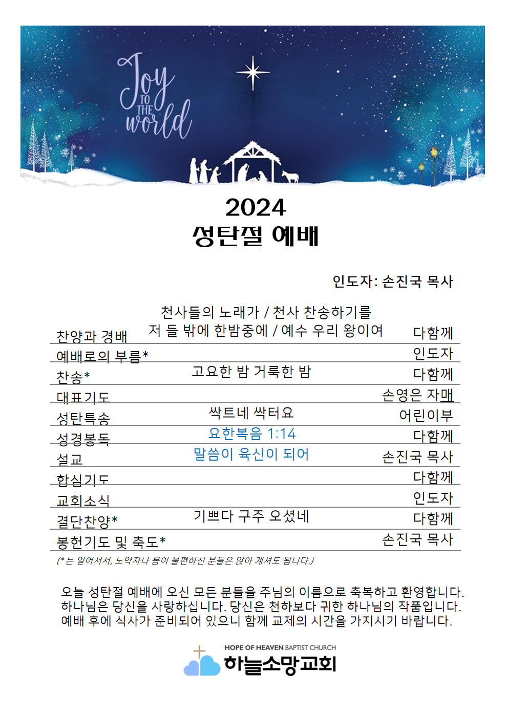 2024. 12. 25. 하늘소망교회 성탄절 예배 찬양 콘티