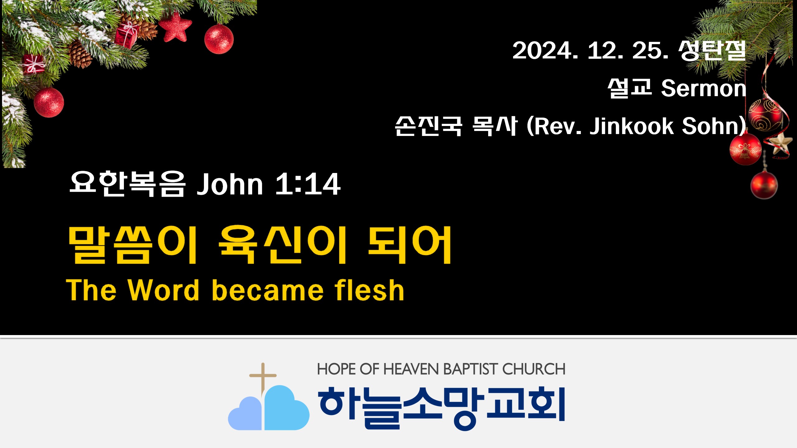 [English Sermon 영어 설교]Christmas, December 25, 2024 - Sermon by Rev. Jinkook (Danny) SohnThe Word Became Flesh (John 1:14)  2024. 12. 25. 성탄절 예배 설교본문: 요한복음 1:14제목: 말씀이 육신이 되어설교자: 손진국 목사 Brothers and Sisters, who is the main character of today, Christmas Day? Jesus. God, who sent His only Son to save us, without hesitation. However, many people in the world are celebrating Christmas with no connec..