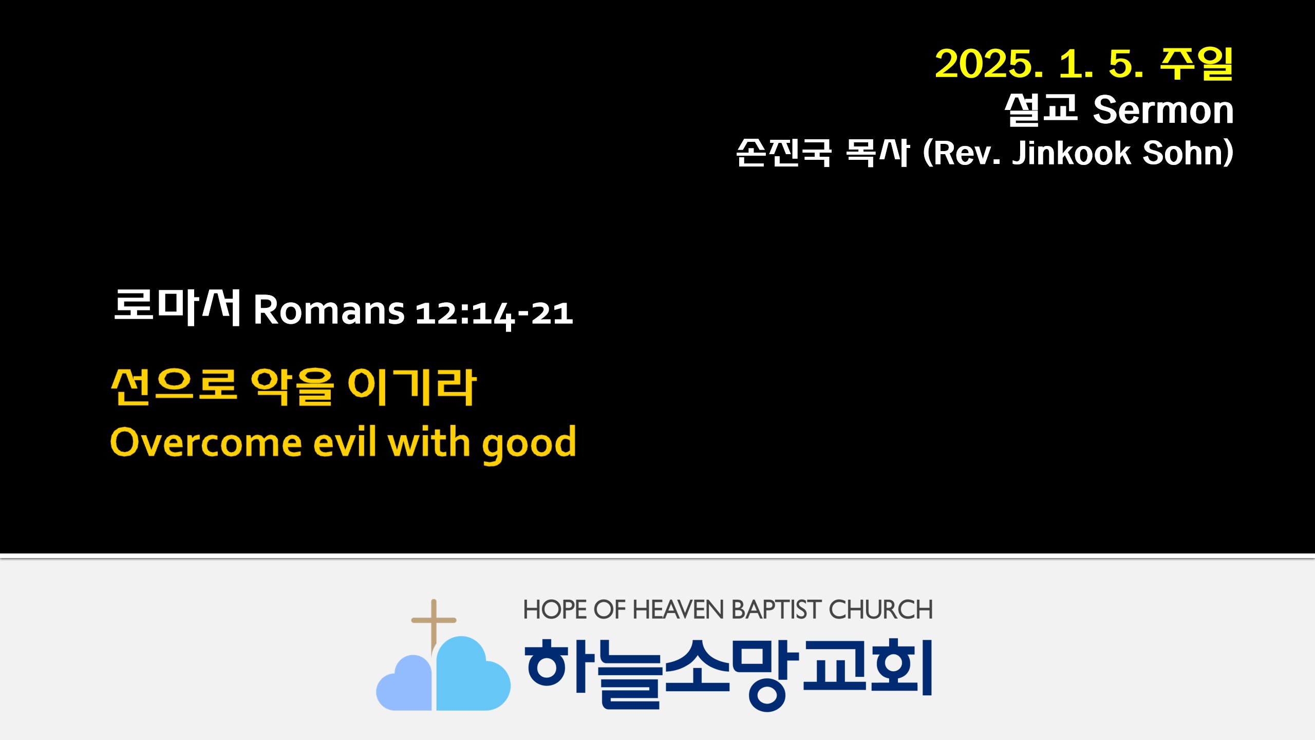 [English Sermon 영어 설교]Sunday, January 5, 2025 - Sermon by Rev. Jinkook (Danny) SohnOvercome Evil with Good (Romans 12:14-21)  2025. 1. 5. 주일예배 설교- 로마서 강해 30본문: 로마서 12:14-21제목: 선으로 악을 이기라설교자: 손진국 목사 Romans 12 teaches how God's children, who have become new people through faith in Jesus Christ, should live in the world. Especially from verse 14 onwards, today's passage shows how Christians can exe..