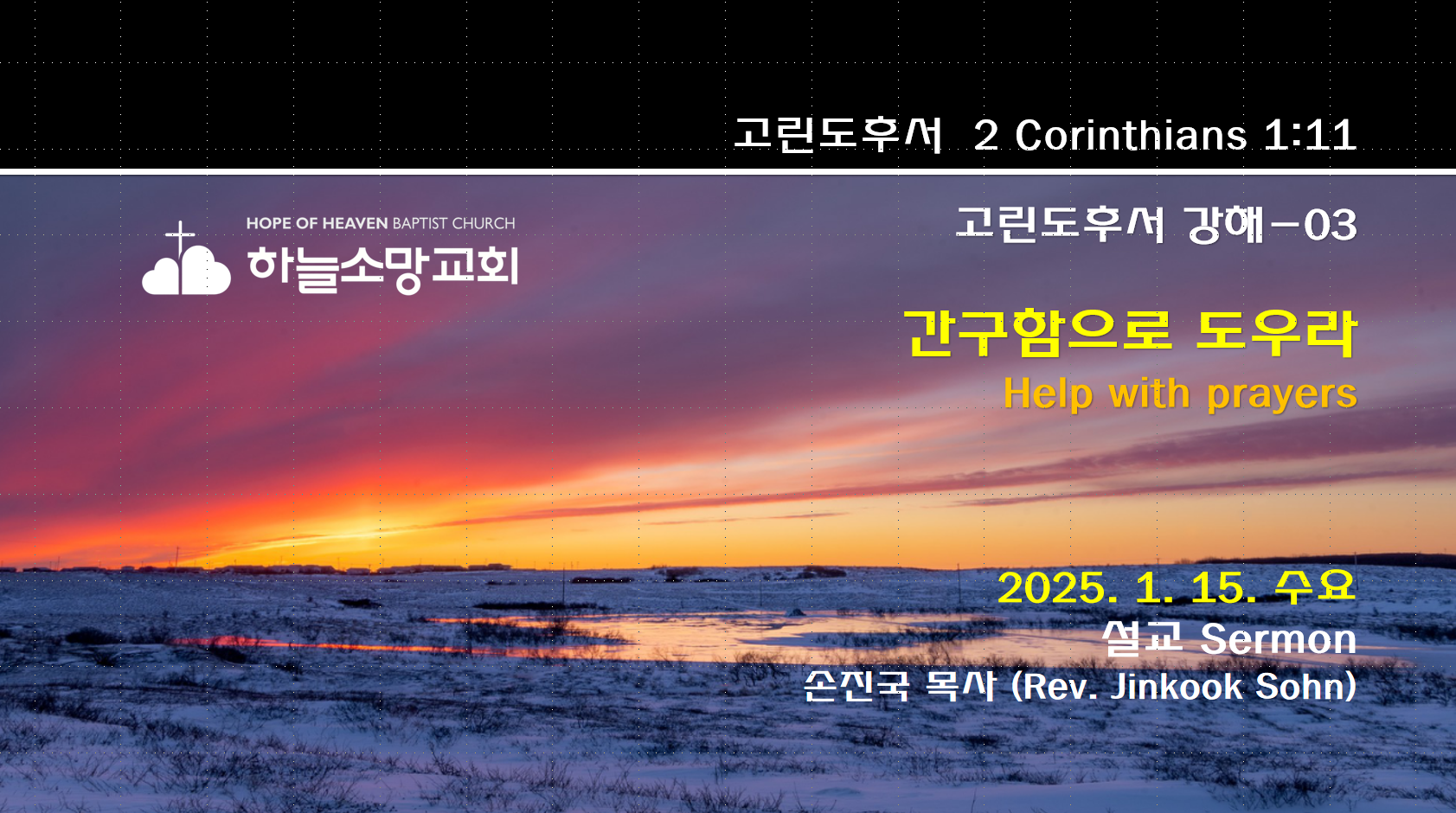 2025. 1. 17. 새벽기도회 설교본문: 마태복음 6:9-13 (주기도문)제목: 영광이 아버지께 영원히 있사옵나이다 아멘설교자: 손진국 목사 [설교 MP3 파일] [마 6:9-13]9 그러므로 너희는 이렇게 기도하라 하늘에 계신 우리 아버지여 이름이 거룩히 여김을 받으시오며10 나라가 임하시오며 뜻이 하늘에서 이루어진 것 같이 땅에서도 이루어지이다11 오늘 우리에게 일용할 양식을 주시옵고12 우리가 우리에게 죄 지은 자를 사하여 준 것 같이 우리 죄를 사하여 주시옵고13 우리를 시험에 들게 하지 마시옵고 다만 악에서 구하시옵소서 (나라와 권세와 영광이 아버지께 영원히 있사옵나이다 아멘) Hope of Heaven Baptist Church 하늘소망교회(담임 손진국 목사)는 뉴질랜드..