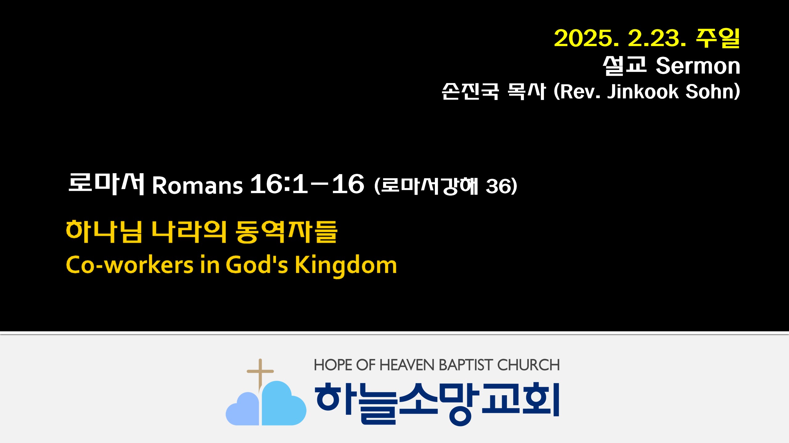 [Sunday, Feburary 23, 2025] Co-workers in God's Kingdom | Romans 16:1-16[English Sermon 영어 설교]Sunday, Feburary 23, 2025 - Sermon by Rev. Jinkook (Danny) Sohn Co-workers in God's Kingdom (Romans 16:1-16) 2025. 2. 23. 주일예배 설교- 로마서 강해 36본문: 로마서 16:1-16 제목: 하나님 나라의 동역자들 설교자: 손진국 목사 What comes to your mind when you think of the Apostle Paul? A great evangelist, a great apostle who wrote half of the ..