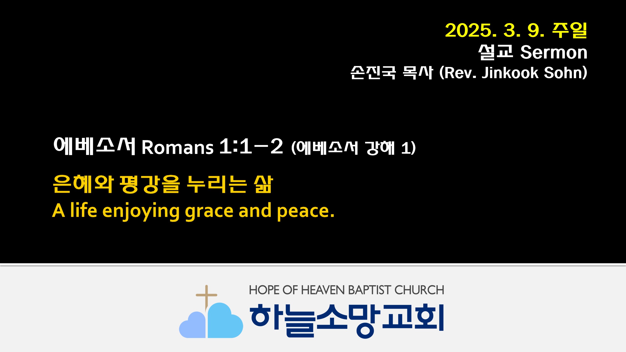 2025. 3. 9. 하늘소망교회 주일예배 동영상본문: 에베소서 1:1-2제목: 은혜와 평강을 누리는 삶설교자: 손진국 목사 [엡 1:1-2]1 하나님의 뜻으로 말미암아 그리스도 예수의 사도 된 바울은 에베소에 있는 성도들과 그리스도 예수 안에 있는 신실한 자들에게 편지하노니2 하나님 우리 아버지와 주 예수 그리스도로부터 은혜와 평강이 너희에게 있을지어다 Hope of Heaven Baptist Church 하늘소망교회(담임 손진국 목사)는 뉴질랜드 오클랜드 북부 실버데일에 세워진 한인교회로 '하나님의 마음으로 사람을 살리는 교회'입니다.