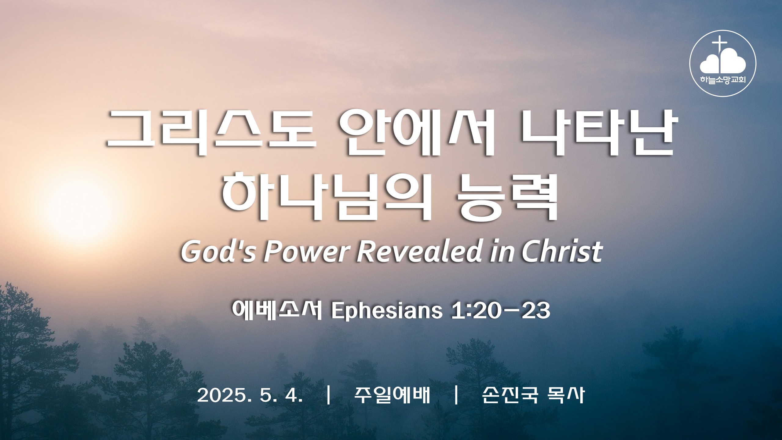 2025. 5. 4. 하늘소망교회 주일예배 동영상본문: 에베소서 1:20-23 제목: 그리스도 안에서 나타난 하나님의 능력 설교자: 손진국 목사 https://youtube.com/live/v_hKxI3oaWM [엡 1:20-23]20 그의 능력이 그리스도 안에서 역사하사 죽은 자들 가운데서 다시 살리시고 하늘에서 자기의 오른편에 앉히사21 모든 통치와 권세와 능력과 주권과 이 세상뿐 아니라 오는 세상에 일컫는 모든 이름 위에 뛰어나게 하시고22 또 만물을 그의 발 아래에 복종하게 하시고 그를 만물 위에 교회의 머리로 삼으셨느니라23 교회는 그의 몸이니 만물 안에서 만물을 충만하게 하시는 이의 충만함이니라 Hope of Heaven Baptist Church 하늘소망교회(담임 손진국 목..