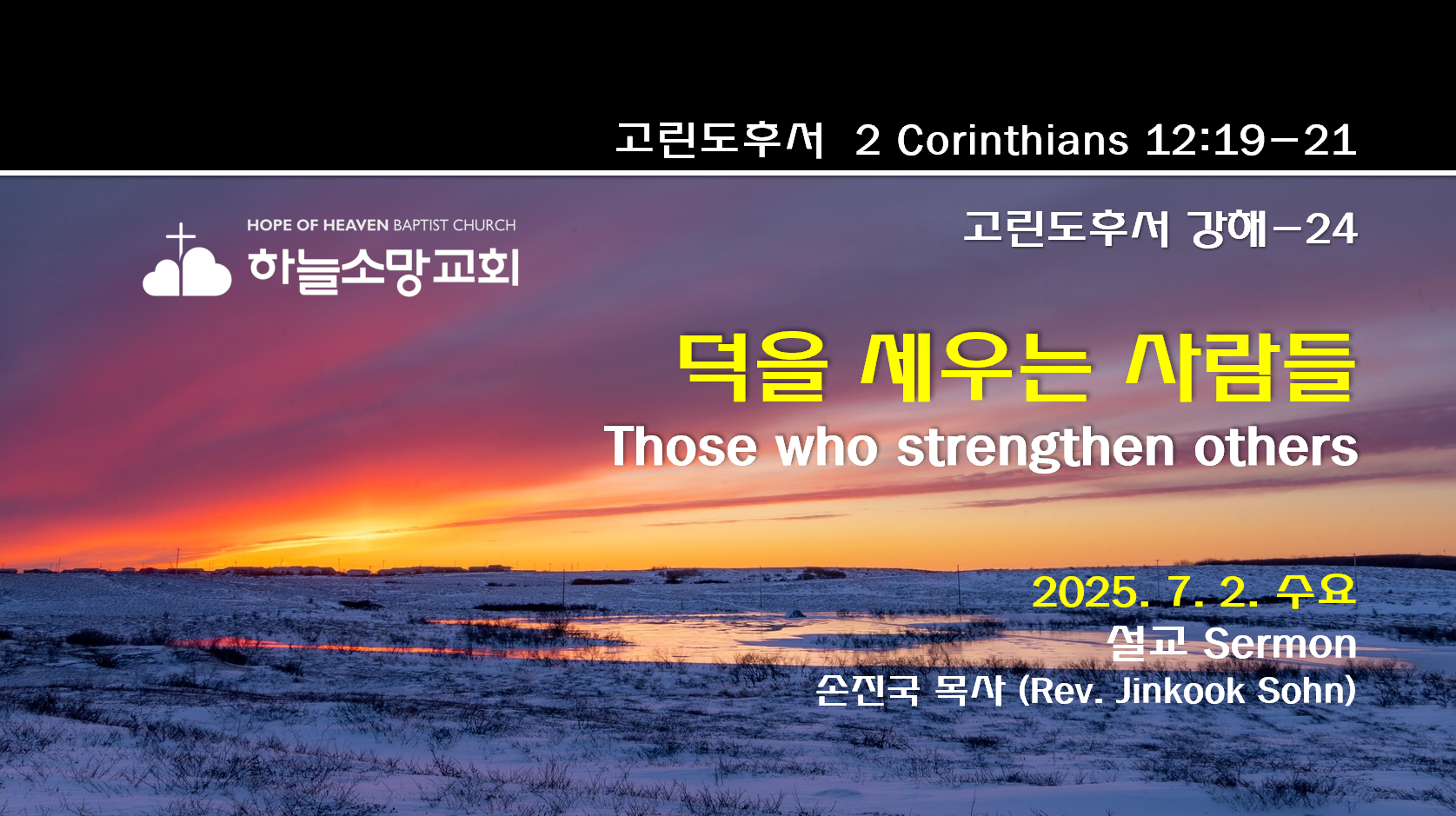 2025. 7. 2. 수요예배 고린도후서 강해-24 본문: 고린도후서 12:19-21제목: 덕을 세우는 사람들설교자: 손진국 목사 [설교 mp3 파일] [고후 12:19-21]19 너희는 이 때까지 우리가 자기 변명을 하는 줄로 생각하는구나 우리는 그리스도 안에서 하나님 앞에 말하노라 사랑하는 자들아 이 모든 것은 너희의 덕을 세우기 위함이니라20 내가 갈 때에 너희를 내가 원하는 것과 같이 보지 못하고 또 내가 너희에게 너희가 원하지 않는 것과 같이 보일까 두려워하며 또 다툼과 시기와 분냄과 당 짓는 것과 비방과 수군거림과 거만함과 혼란이 있을까 두려워하고21 또 내가 다시 갈 때에 내 하나님이 나를 너희 앞에서 낮추실까 두려워하고 또 내가 전에 죄를 지은 여러 사람의 그 행한 바 더러움과..