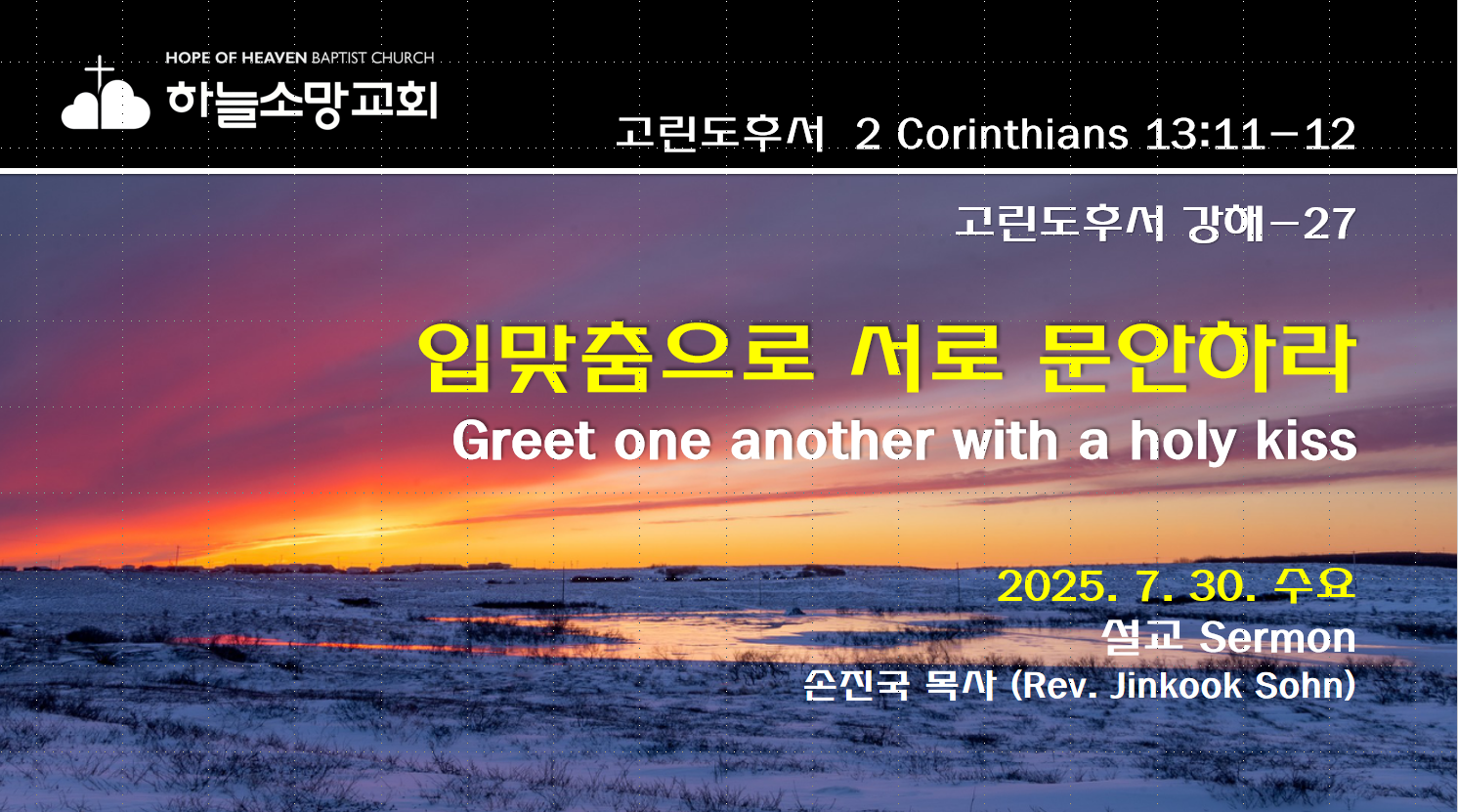2025. 7. 30. 수요예배 고린도후서 강해-27 본문: 고린도후서 13:11-12제목: 입맞춤으로 서로 문안하라설교자: 손진국 목사 [설교 mp3 파일] [고후 13:11-12]11 마지막으로 말하노니 형제들아 기뻐하라 온전하게 되며 위로를 받으며 마음을 같이하며 평안할지어다 또 사랑과 평강의 하나님이 너희와 함께 계시리라 거룩하게 입맞춤으로 서로 문안하라12 모든 성도가 너희에게 문안하느니라 Hope of Heaven Baptist Church 하늘소망교회(담임 손진국 목사)는 뉴질랜드 오클랜드 북부 실버데일에 세워진 한인교회로 '하나님의 마음으로 사람을 살리는 교회'입니다.