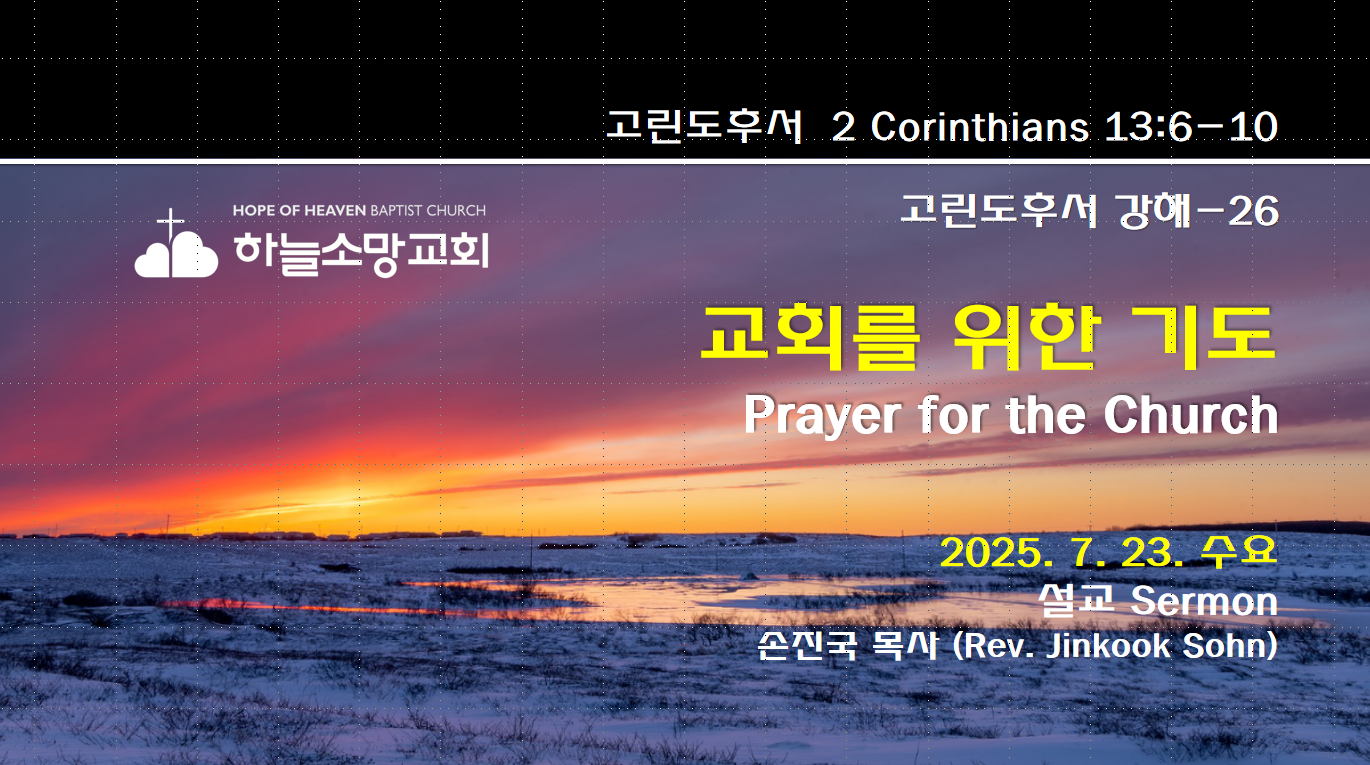2025. 7. 23. 수요예배 고린도후서 강해-26 본문: 고린도후서 13:6-10제목: 교회를 위한 기도설교자: 손진국 목사 [설교 mp3 파일] [고후 13:6-10]6 우리가 버림 받은 자 되지 아니한 것을 너희가 알기를 내가 바라고7 우리가 하나님께서 너희로 악을 조금도 행하지 않게 하시기를 구하노니 이는 우리가 옳은 자임을 나타내고자 함이 아니라 오직 우리는 버림 받은 자 같을지라도 너희는 선을 행하게 하고자 함이라8 우리는 진리를 거슬러 아무 것도 할 수 없고 오직 진리를 위할 뿐이니9 우리가 약할 때에 너희가 강한 것을 기뻐하고 또 이것을 위하여 구하니 곧 너희가 온전하게 되는 것이라10 그러므로 내가 떠나 있을 때에 이렇게 쓰는 것은 대면할 때에 주께서 너희를 넘어뜨리..