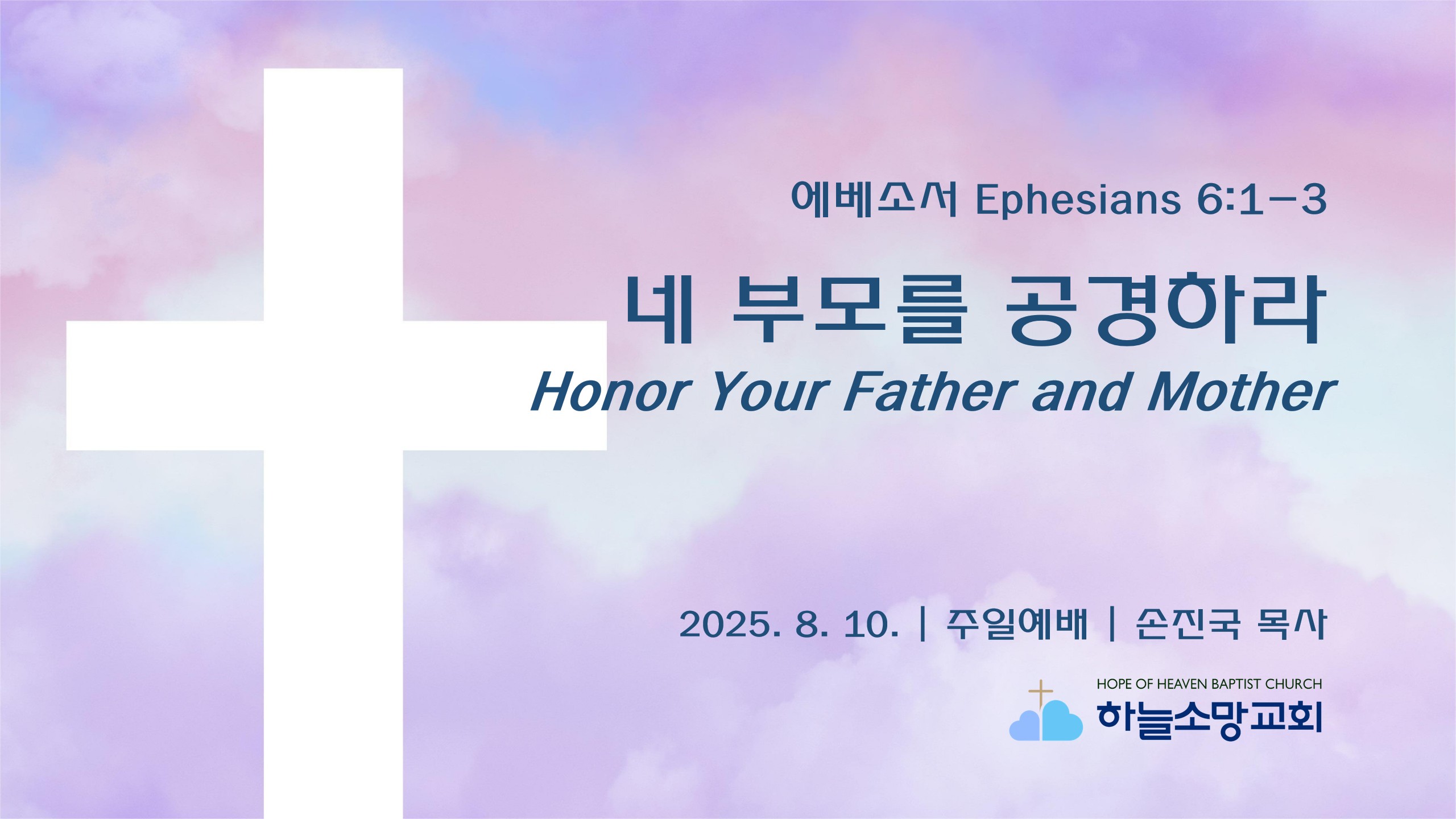[2025. 8. 10.] (에베소서 강해 20) 네 부모를 공경하라 | 에베소서 6:1-3 https://youtu.be/vFtL3nkc4Mc 2025. 8. 10. 주일예배 설교- 에베소서 강해 20본문: 에베소서 6:1-3 제목: 네 부모를 공경하라 설교자: 손진국 목사 [엡 6:1-3]1 자녀들아 주 안에서 너희 부모에게 순종하라 이것이 옳으니라2 네 아버지와 어머니를 공경하라 이것은 약속이 있는 첫 계명이니3 이로써 네가 잘되고 땅에서 장수하리라 Hope of Heaven Baptist Church 하늘소망교회(담임 손진국 목사)는 뉴질랜드 오클랜드 북부 실버데일에 세워진 한인교회로 '하나님의 마음으로 사람을 살리는 교회'입니다.