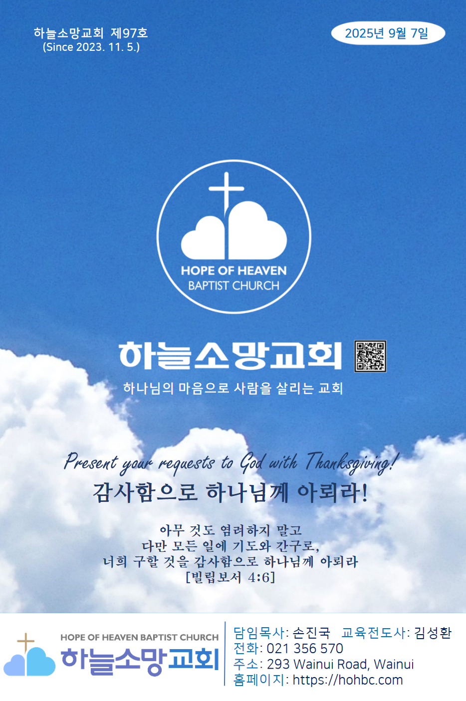 2025년 9월 7일 주보 (제 97호) 2025년 9월 7일하늘소망교회 제 97호 주보 Hope of Heaven Baptist Church 하늘소망교회(담임 손진국 목사)는 뉴질랜드 오클랜드 북부 실버데일에 세워진 한인교회로 '하나님의 마음으로 사람을 살리는 교회'입니다.
