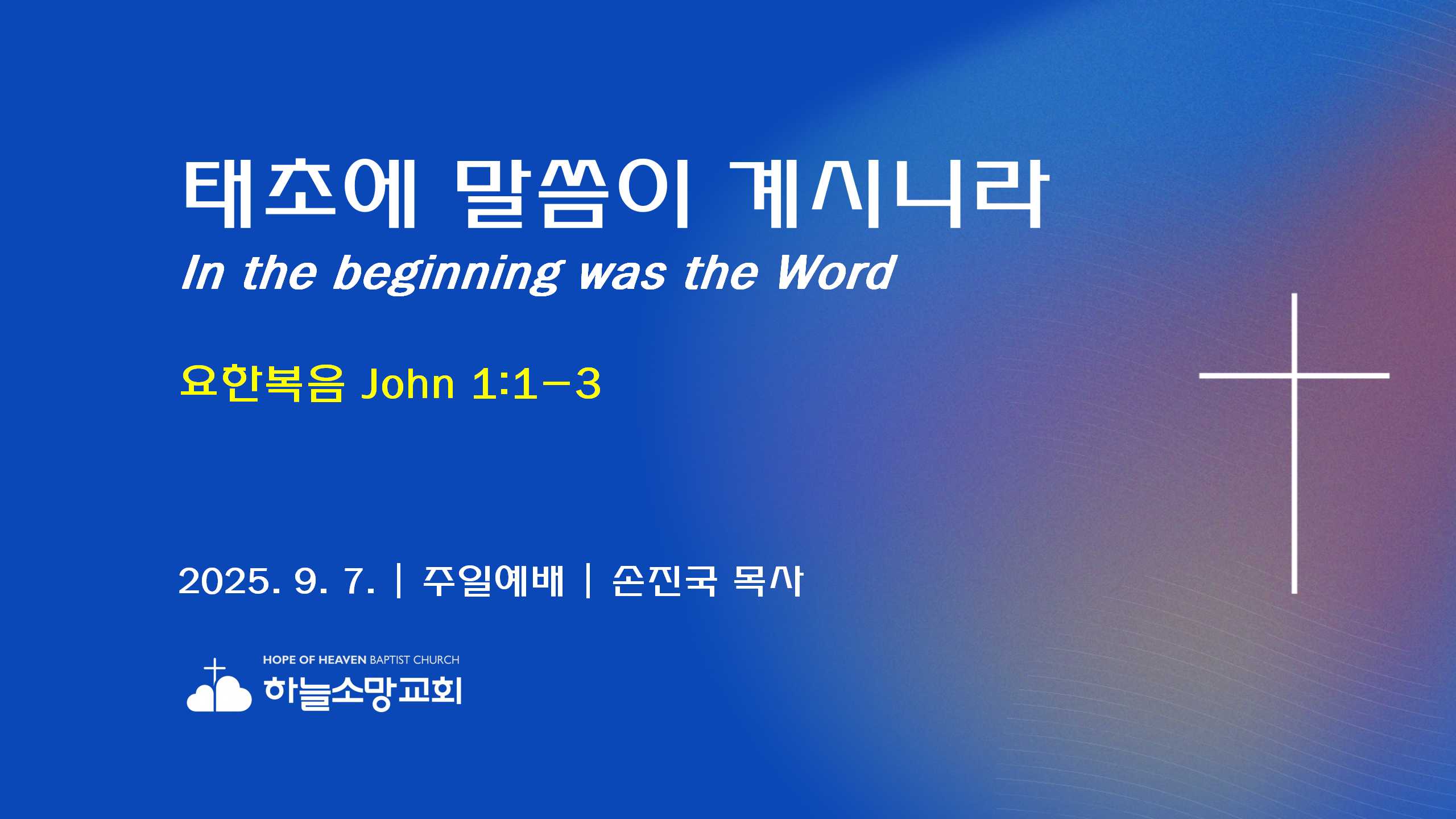 [ 2025. 9. 7.] (요한복음 강해 1) 태초에 말씀이 계시니라 | 요한복음 1:1-3 https://youtu.be/6SibdcDHHfU 2025. 9. 7. 주일예배 설교- 요한복음 강해 1본문: 요한복음 1:1-3 제목: 태초에 말씀이 계시니라 설교자: 손진국 목사 [요 1:1-3]1 태초에 말씀이 계시니라 이 말씀이 하나님과 함께 계셨으니 이 말씀은 곧 하나님이시니라2 그가 태초에 하나님과 함께 계셨고3 만물이 그로 말미암아 지은 바 되었으니 지은 것이 하나도 그가 없이는 된 것이 없느니라 Hope of Heaven Baptist Church 하늘소망교회(담임 손진국 목사)는 뉴질랜드 오클랜드 북부 실버데일에 세워진 한인교회로 '하나님의 마음으로 사람을 살리는 교회'입니다.