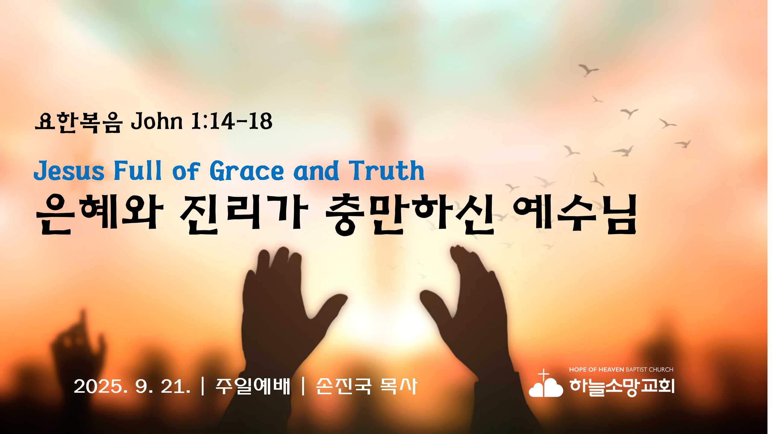 [ 2025. 9. 21.] (요한복음 강해 3) 은혜와 진리가 충만하신 예수님 | 요한복음 1:14-18 https://youtu.be/PJB4SZV-FRw 2025. 9. 21. 주일예배 설교- 요한복음 강해 3본문: 요한복음 1:14-18 제목: 은혜와 진리가 충만하신 예수님 설교자: 손진국 목사 [요 1:14-18]14 말씀이 육신이 되어 우리 가운데 거하시매 우리가 그의 영광을 보니 아버지의 독생자의 영광이요 은혜와 진리가 충만하더라15 요한이 그에 대하여 증언하여 외쳐 이르되 내가 전에 말하기를 내 뒤에 오시는 이가 나보다 앞선 것은 나보다 먼저 계심이라 한 것이 이 사람을 가리킴이라 하니라16 우리가 다 그의 충만한 데서 받으니 은혜 위에 은혜러라17 율법은 모세로 말미암..