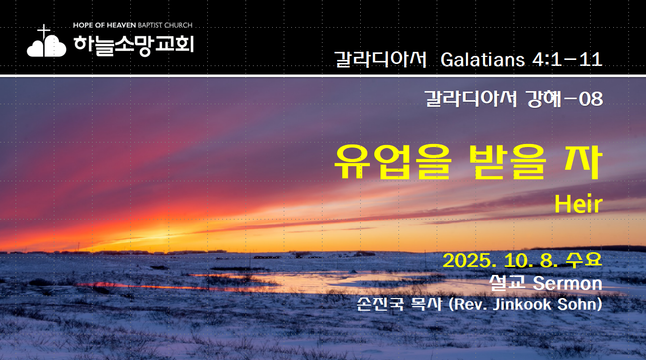 2025. 10. 8. 수요예배 갈라디아서 강해-8 본문: 갈라디아서 4:1-11제목: 유업을 받을 자설교자: 손진국 목사 [설교 mp3 파일] [갈 4:1-11]1 내가 또 말하노니 유업을 이을 자가 모든 것의 주인이나 어렸을 동안에는 종과 다름이 없어서2 그 아버지가 정한 때까지 후견인과 청지기 아래에 있나니3 이와 같이 우리도 어렸을 때에 이 세상의 초등학문 아래에 있어서 종 노릇 하였더니4 때가 차매 하나님이 그 아들을 보내사 여자에게서 나게 하시고 율법 아래에 나게 하신 것은5 율법 아래에 있는 자들을 속량하시고 우리로 아들의 명분을 얻게 하려 하심이라6 너희가 아들이므로 하나님이 그 아들의 영을 우리 마음 가운데 보내사 아빠 아버지라 부르게 하셨느니라7 그러므로 네가..