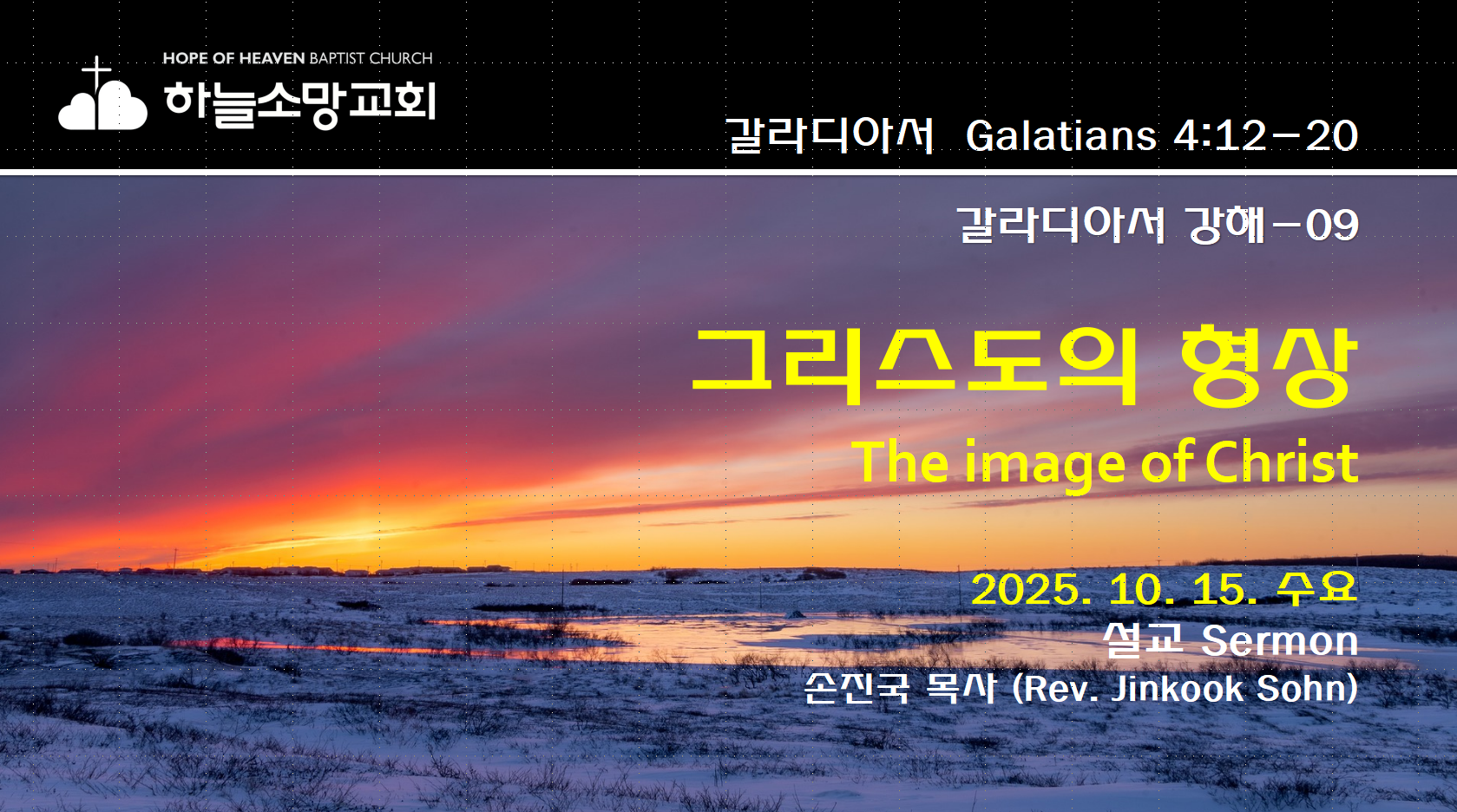 2025. 10. 15. 수요예배 갈라디아서 강해-9 본문: 갈라디아서 4:12-20제목: 그리스도의 형상설교자: 손진국 목사 [설교 mp3 파일] [갈 ]12 형제들아 내가 너희와 같이 되었은즉 너희도 나와 같이 되기를 구하노라 너희가 내게 해롭게 하지 아니하였느니라13 내가 처음에 육체의 약함으로 말미암아 너희에게 복음을 전한 것을 너희가 아는 바라14 너희를 시험하는 것이 내 육체에 있으되 이것을 너희가 업신여기지도 아니하며 버리지도 아니하고 오직 나를 하나님의 천사와 같이 또는 그리스도 예수와 같이 영접하였도다15 너희의 복이 지금 어디 있느냐 내가 너희에게 증언하노니 너희가 할 수만 있었더라면 너희의 눈이라도 빼어 나에게 주었으리라16 그런즉 내가 너희에게 참된 말을 하므로 ..