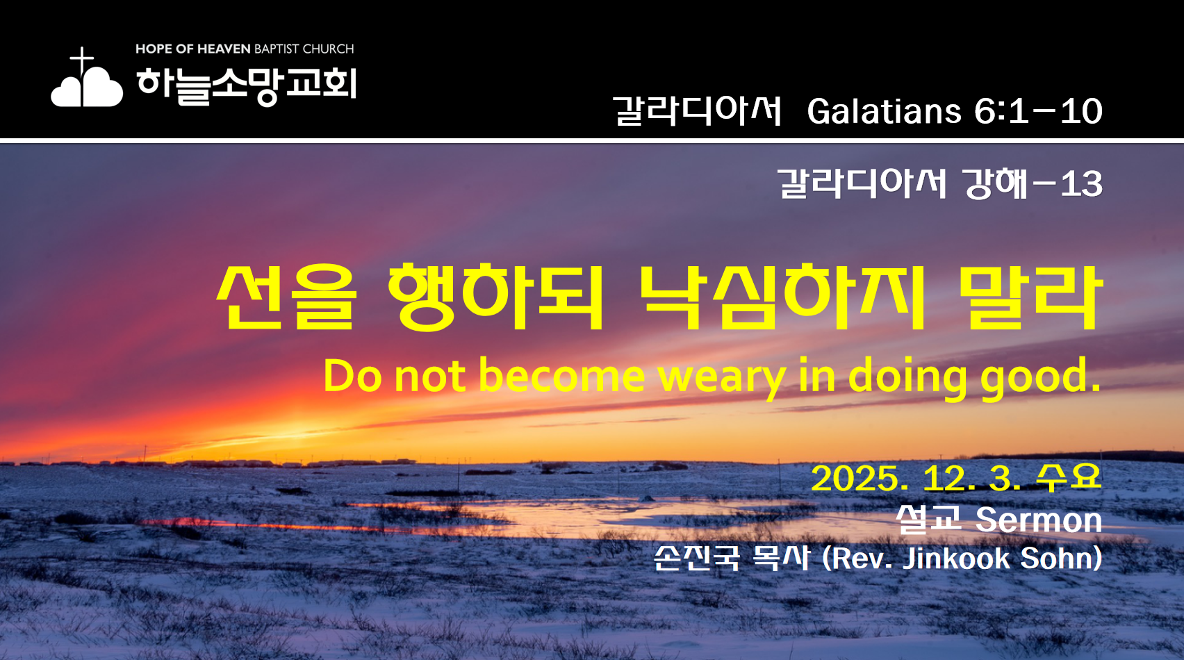 [2025. 12. 3.] (갈12) 선한 일을 행하되 낙심하지 말라 | 갈라디아서 6:1-102025. 12. 3. 수요예배 갈라디아서 강해-12본문: 갈라디아서 6:1-10제목: 선한 일을 행하되 낙심하지 말라설교자: 손진국 목사 [설교 mp3 파일] [갈 6:1-10]1 형제들아 사람이 만일 무슨 범죄한 일이 드러나거든 신령한 너희는 온유한 심령으로 그러한 자를 바로잡고 너 자신을 살펴보아 너도 시험을 받을까 두려워하라2 너희가 짐을 서로 지라 그리하여 그리스도의 법을 성취하라3 만일 누가 아무 것도 되지 못하고 된 줄로 생각하면 스스로 속임이라4 각각 자기의 일을 살피라 그리하면 자랑할 것이 자기에게는 있어도 남에게는 있지 아니하리니5 각각 자기의 짐을 질 것이라6 가르침을..
