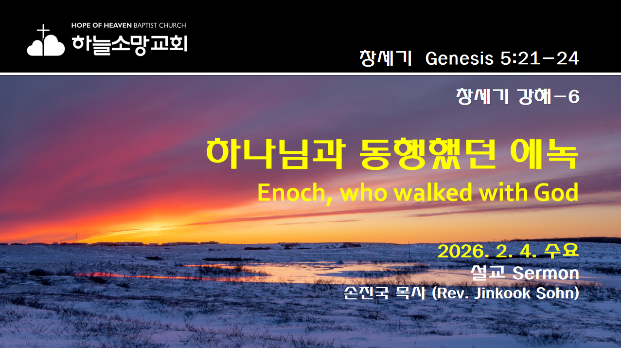 [2026. 2. 4.] (창6) 하나님과 동행한 에녹 | 창세기 5:21-242026. 2. 4. 수요예배 창세기 강해-6 본문: 창세기 5:21-24제목: 하나님과 동행한 에녹설교자: 손진국 목사 [설교 mp3 파일] [창 5:21-24]21 에녹은 육십오 세에 므두셀라를 낳았고22 므두셀라를 낳은 후 삼백 년을 하나님과 동행하며 자녀들을 낳았으며23 그는 삼백육십오 세를 살았더라24 에녹이 하나님과 동행하더니 하나님이 그를 데려가시므로 세상에 있지 아니하였더라 Hope of Heaven Baptist Church 하늘소망교회(담임 손진국 목사)는 뉴질랜드 오클랜드 북부 실버데일에 세워진 한인교회로 '하나님의 마음으로 사람을 살리는 교회'입니다.
