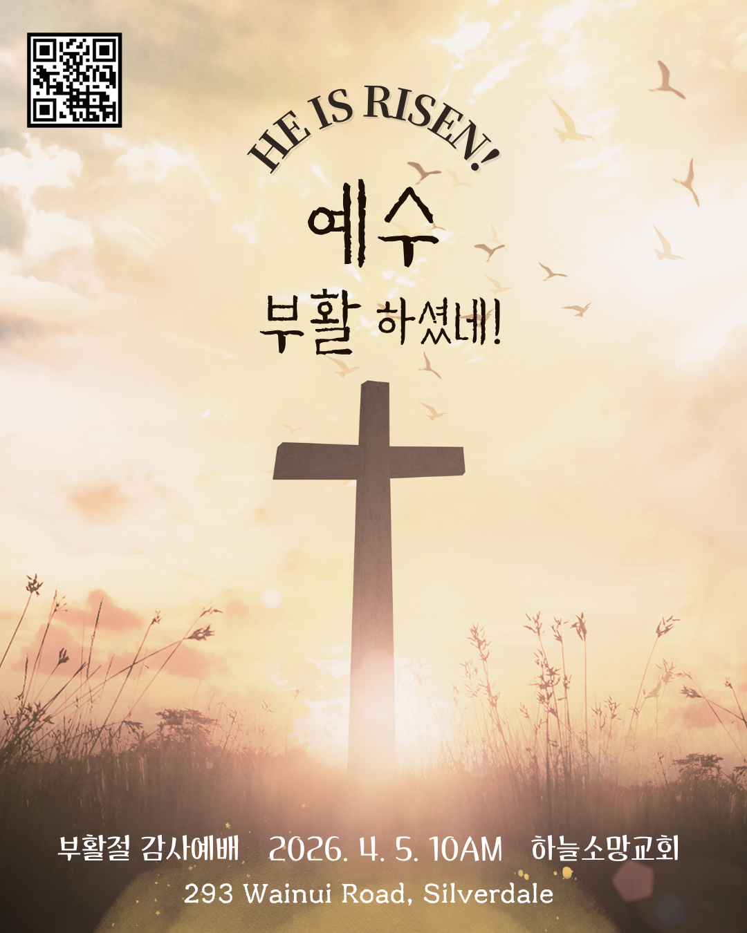 [2026. 4. 5.] 2026년 부활절 감사예배 이웃 초대장 하늘소망교회(담임 손진국 목사)는 뉴질랜드 오클랜드 북부 실버데일에 세워진 한인교회로 '하나님의 마음으로 사람을 살리는 교회'입니다.Hope of Heaven Baptist Church (Senior Pastor: Rev. Jinkook Sohn) is a Korean church established in Silverdale, Auckland, New Zealand. It is a church that saves people with the heart of God.