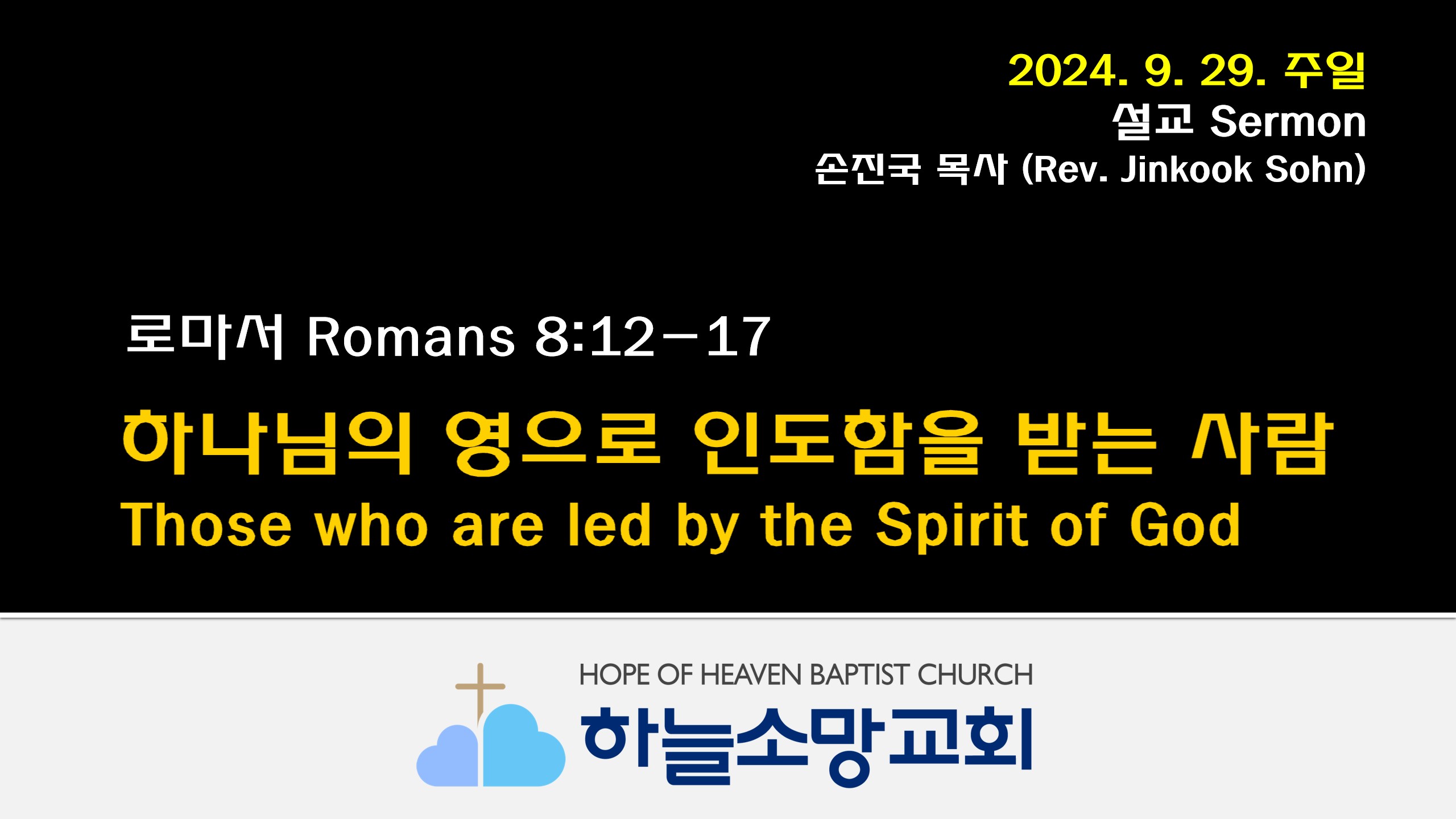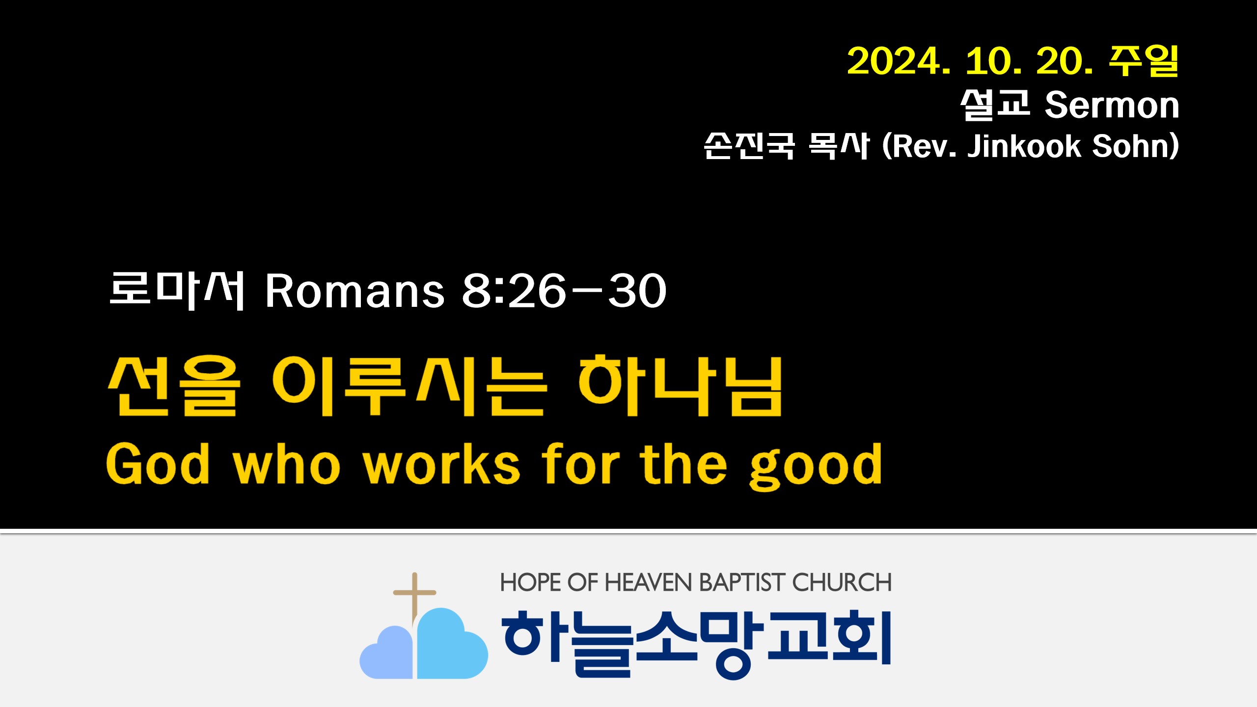 2024. 10. 20. 주일예배 설교- 로마서 강해 20본문: 로마서 8:26-30제목: 선을 이루시는 하나님설교자: 손진국 목사 https://youtu.be/Nt4gcvHIDuY [롬 8:26-30]26 이와 같이 성령도 우리의 연약함을 도우시나니 우리는 마땅히 기도할 바를 알지 못하나 오직 성령이 말할 수 없는 탄식으로 우리를 위하여 친히 간구하시느니라27 마음을 살피시는 이가 성령의 생각을 아시나니 이는 성령이 하나님의 뜻대로 성도를 위하여 간구하심이니라28 우리가 알거니와 하나님을 사랑하는 자 곧 그의 뜻대로 부르심을 입은 자들에게는 모든 것이 합력하여 선을 이루느니라29 하나님이 미리 아신 자들을 또한 그 아들의 형상을 본받게 하기 위하여 미리 정하셨으니 이는 그로 많은 형제 ..