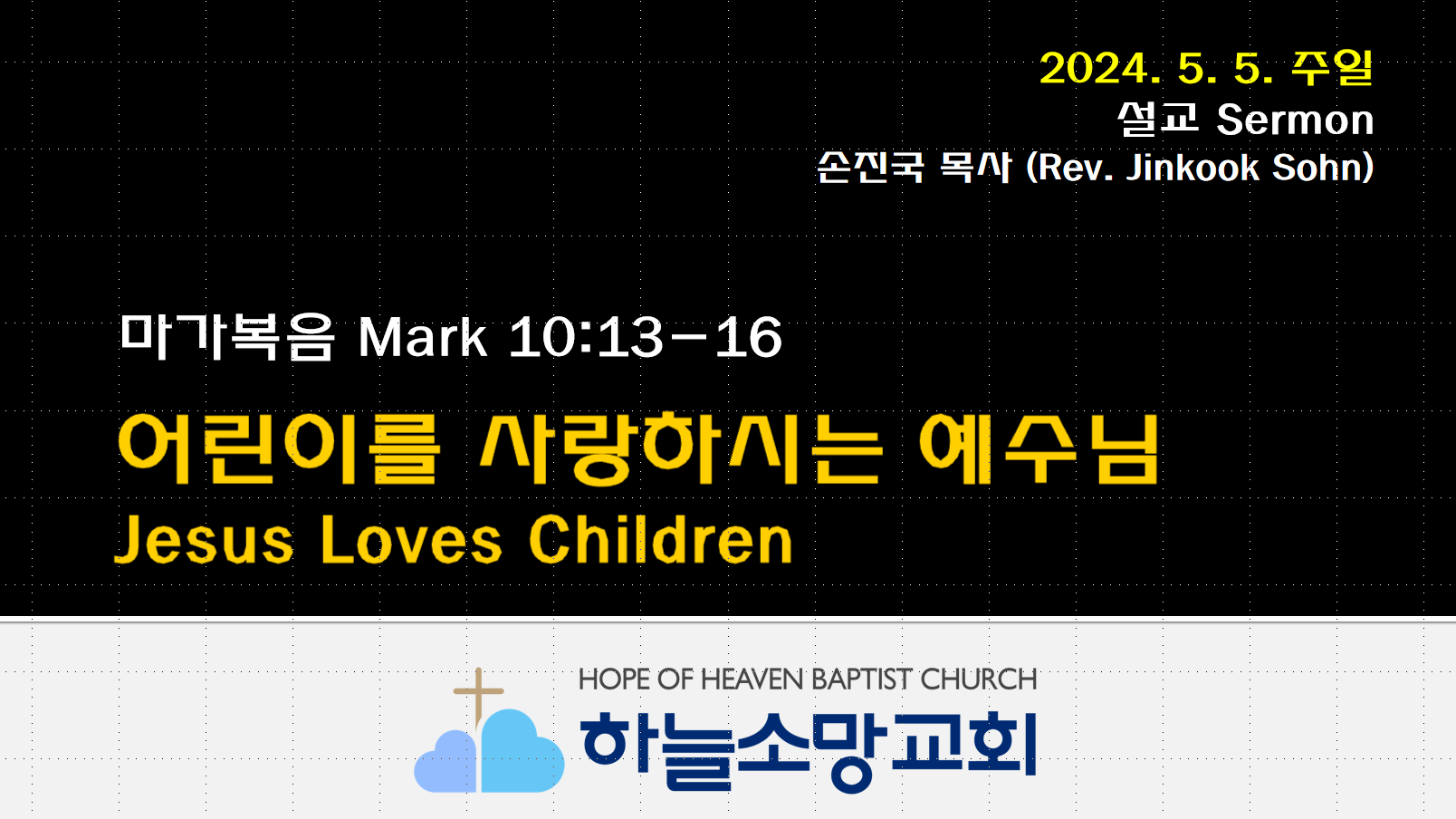 [2024. 5. 5.] 어린이를 사랑하시는 예수님 | 마가복음 10:13-16 2024. 5. 5. 주일예배 본문: 마가복음 10:13-16 제목: 어린이를 사랑하시는 예수님 설교자: 손진국 목사 하늘소망교회(담임 손진국 목사)는 뉴질랜드 오클랜드 북부 실버데일에 세워진 한인교회로 '하나님의 마음으로 사람을 살리는 교회'입니다. 설교 Sermon/주일예배 Sunday 2024.06.15