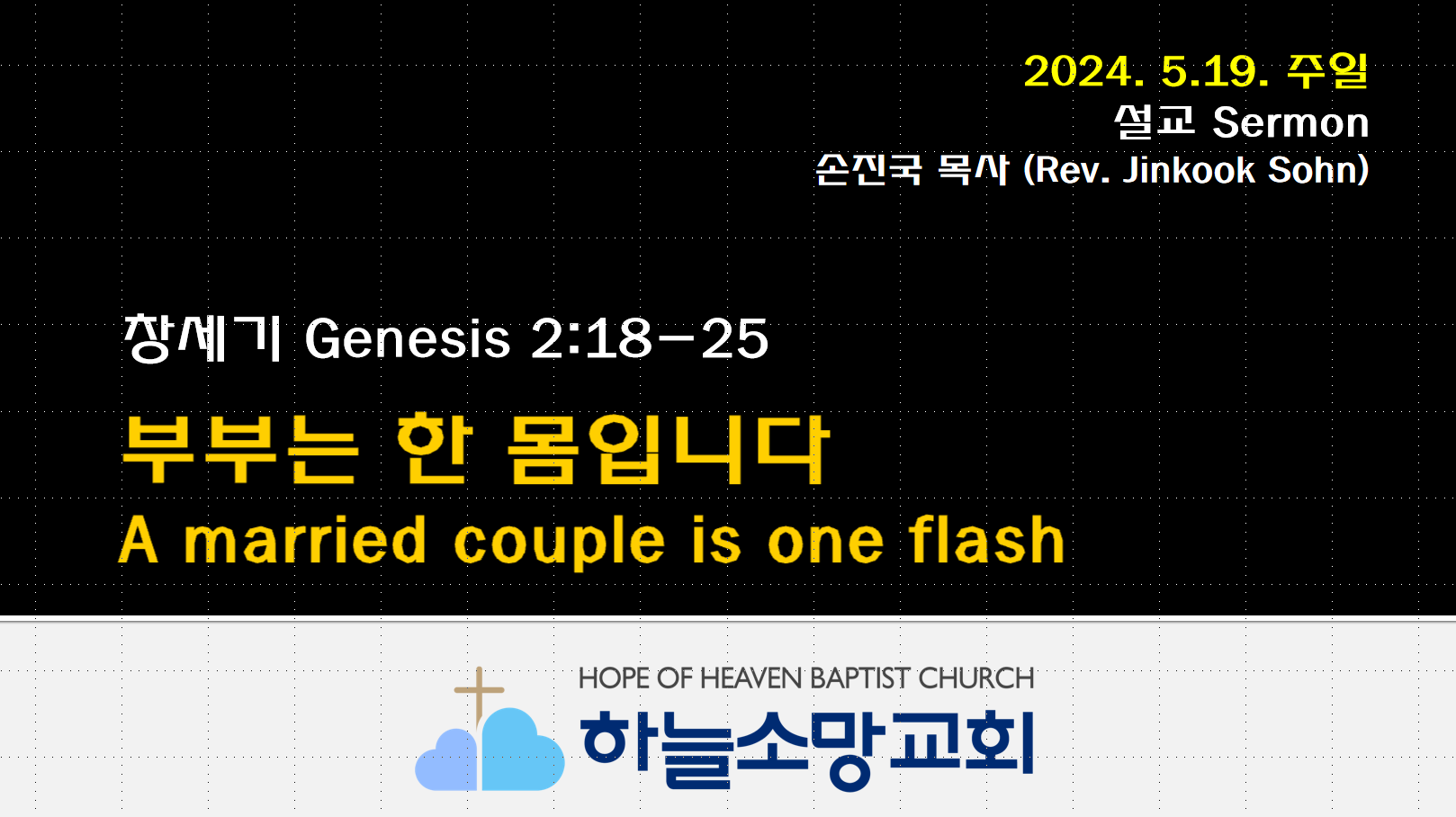 [2024. 5. 26.] 부부는 한 몸입니다 | 창세기 2:18-25 2024. 5. 26. 주일예배 본문: 창세기 2:18-25 제목: 부부는 한 몸입니다 설교자: 손진국 목사 하늘소망교회(담임 손진국 목사)는 뉴질랜드 오클랜드 북부 실버데일에 세워진 한인교회로 '하나님의 마음으로 사람을 살리는 교회'입니다. 설교 Sermon/주일예배 Sunday 2024.06.15