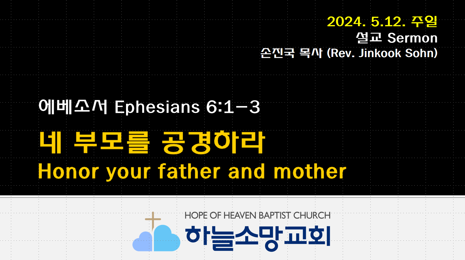 [2024. 5. 12.] 네 부모를 공경하라 | 에베소서 6:1-3 2024. 5. 12. 주일예배 본문: 에베소서 6:1-3 제목: 네 부모를 공경하라 설교자: 손진국 목사 하늘소망교회(담임 손진국 목사)는 뉴질랜드 오클랜드 북부 실버데일에 세워진 한인교회로 '하나님의 마음으로 사람을 살리는 교회'입니다. 설교 Sermon/주일예배 Sunday 2024.06.15