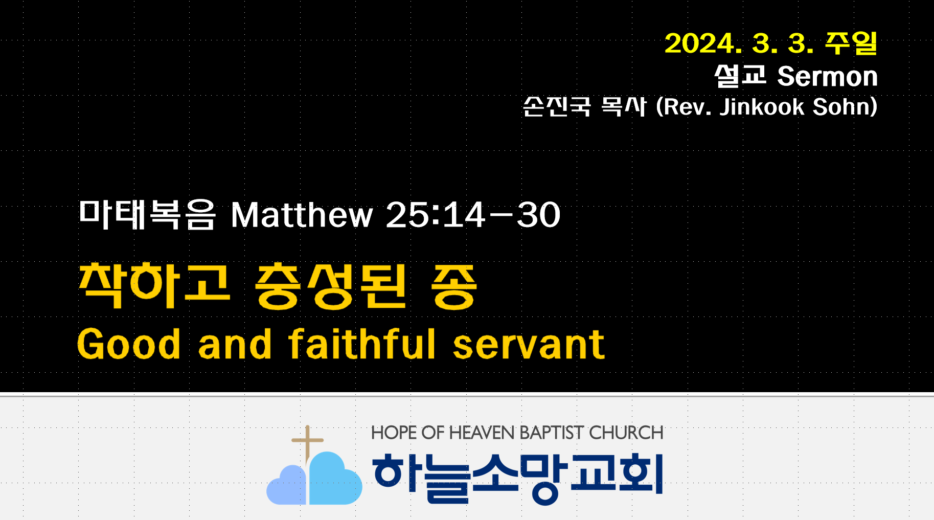 [2024. 3. 3.] 착하고 충성된 종 | 마태복음 25:14-30 2014. 3. 3. 주일예배 본문: 마태복음 25:14-30제목: 착하고 충성된 종설교자: 손진국 목사 하늘소망교회(담임 손진국 목사)는 뉴질랜드 오클랜드 북부 실버데일에 세워진 한인교회로 '하나님의 마음으로 사람을 살리는 교회'입니다. 설교 Sermon/주일예배 Sunday 2024.06.09