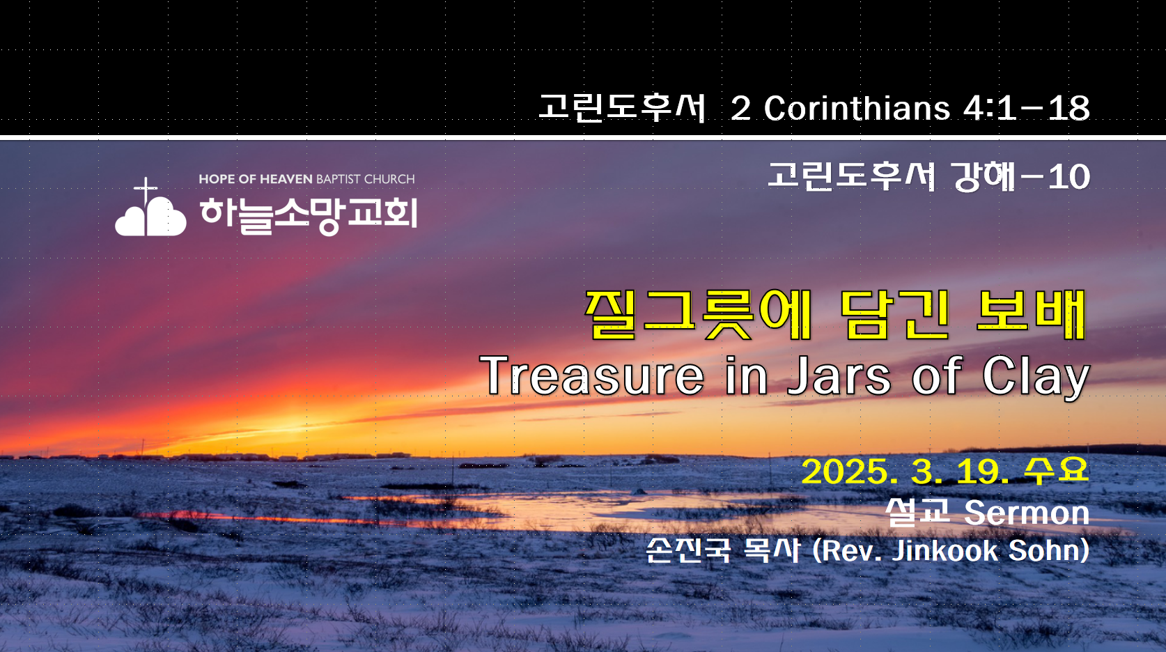 2025. 3. 19. 수요예배 고린도후서 강해-10 본문: 고린도후서 4:1-18제목: 일꾼의 자세설교자: 손진국 목사 [설교 mp3 파일] [고후 4:1-18]1 그러므로 우리가 이 직분을 받아 긍휼하심을 입은 대로 낙심하지 아니하고2 이에 숨은 부끄러움의 일을 버리고 속임으로 행하지 아니하며 하나님의 말씀을 혼잡하게 하지 아니하고 오직 1)진리를 나타냄으로 하나님 앞에서 각 사람의 양심에 대하여 스스로 추천하노라3 만일 우리의 복음이 가리었으면 망하는 자들에게 가리어진 것이라4 그 중에 이 세상의 신이 믿지 아니하는 자들의 마음을 혼미하게 하여 그리스도의 영광의 복음의 광채가 비치지 못하게 함이니 그리스도는 하나님의 형상이니라5 우리는 우리를 전파하는 것이 아니라 오직 그리스도 ..