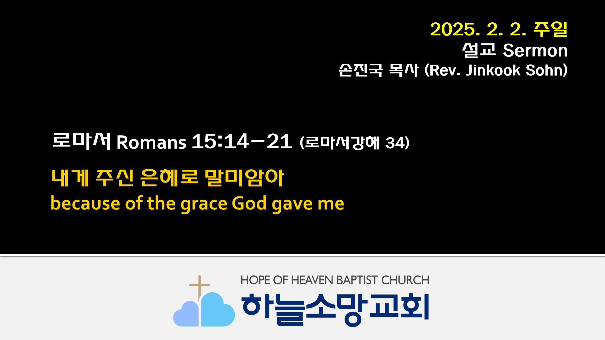 2025. 2. 2. 하늘소망교회 주일예배 동영상본문: 로마서 15:14-21제목: 내게 주신 은혜로 말미암아설교자: 손진국 목사 [롬 15:14-21]14 내 형제들아 너희가 스스로 선함이 가득하고 모든 지식이 차서 능히 서로 권하는 자임을 나도 확신하노라15 그러나 내가 너희로 다시 생각나게 하려고 하나님께서 내게 주신 은혜로 말미암아 더욱 담대히 대략 너희에게 썼노니16 이 은혜는 곧 나로 이방인을 위하여 그리스도 예수의 일꾼이 되어 하나님의 복음의 제사장 직분을 하게 하사 이방인을 제물로 드리는 것이 성령 안에서 거룩하게 되어 받으실 만하게 하려 하심이라17 그러므로 내가 그리스도 예수 안에서 하나님의 일에 대하여 자랑하는 것이 있거니와18 그리스도께서 이방인들을 순종하게..