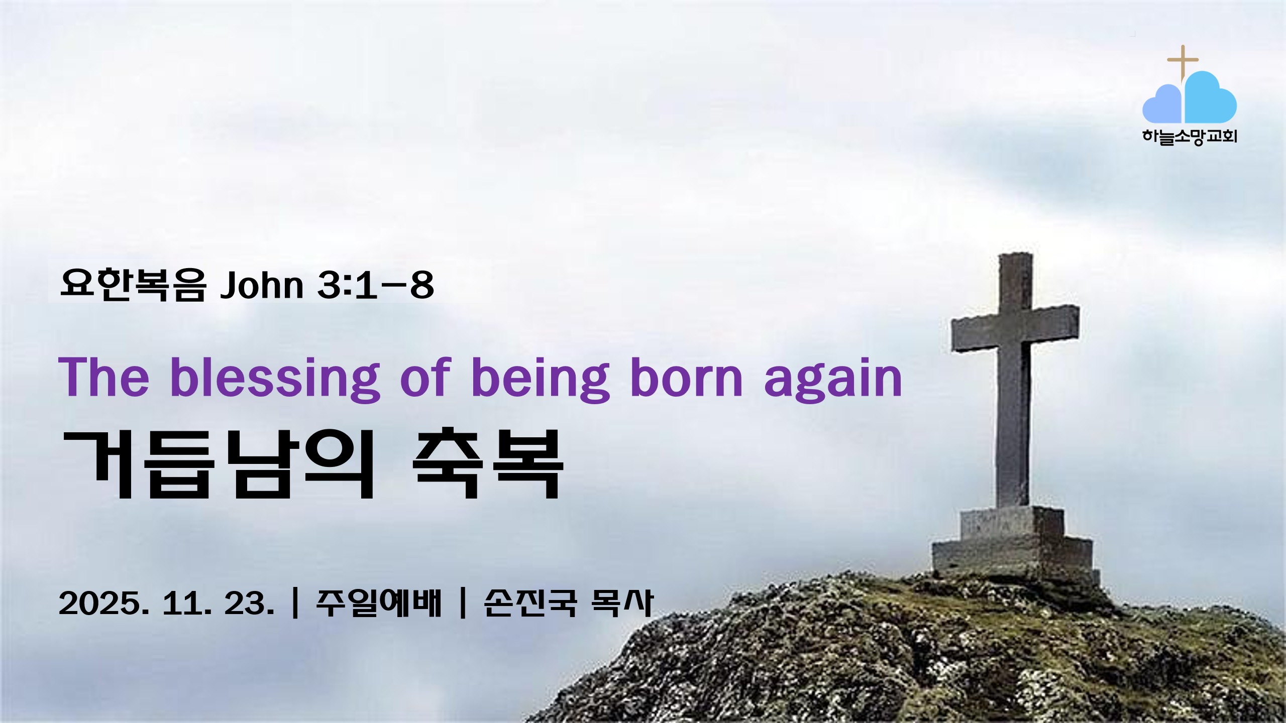 [Sunday, November 23, 2025] The Blessing of Being Born Again | John 3:1–8Sermon by Rev. Jinkook (Danny) Sohn (Hope of Heaven Baptist Chuch) 2025. 11. 23. 주일예배 설교- 요한복음 강해 9본문: 요한복음 3:1–8제목: 거듭남의 축복설교자: 손진국 목사 (하늘소망교회) Greet the person next to you—“Welcome. It’s really great weather for worship today.”I want to begin today’s message with a question. “Have you been born again?” Ask the person ne..