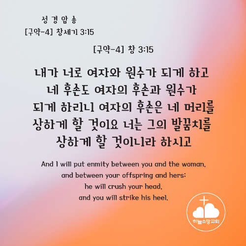 [ 구약- 4] 창 3:15 내가 너로 여자와 원수가 되게 하고 네 후손도 여자의 후손과 원수가 되게 하리니 여자의 후손은 네 머리를 상하게 할 것이요 너는 그의 발꿈치를 상하게 할 것이니라 하시고