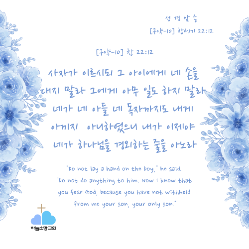 [ 구약- 10] 창 22:12 사자가 이르시되 그 아이에게 네 손을 대지 말라 그에게 아무 일도 하지 말라 네가 네 아들 네 독자까지도 내게 아끼지 아니하였으니 내가 이제야 네가 하나님을 경외하는 줄을 아노라