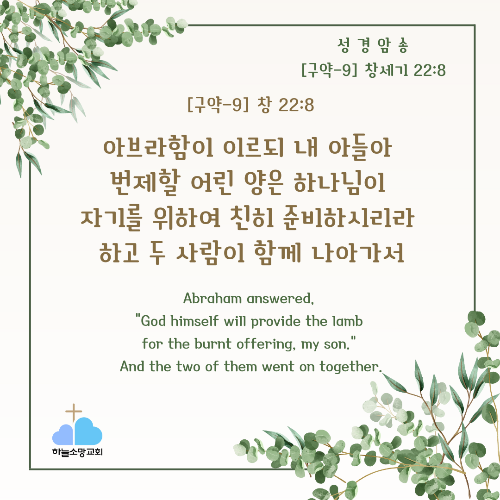 [ 구약- 9] 창 22:8 아브라함이 이르되 내 아들아 번제할 어린 양은 하나님이 자기를 위하여 친히 준비하시리라 하고 두 사람이 함께 나아가서