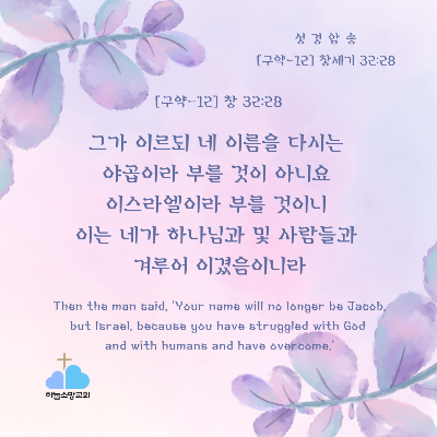 [ 구약- 12] 창 32:28 그가 이르되 네 이름을 다시는 야곱이라 부를 것이 아니요 1)이스라엘이라 부를 것이니 이는 네가 하나님과 및 사람들과 겨루어 이겼음이니라