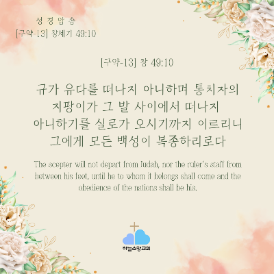 [ 구약- 13] 창 49:10 규가 유다를 떠나지 아니하며 통치자의 지팡이가 그 발 사이에서 떠나지 아니하기를 실로가 오시기까지 이르리니 그에게 모든 백성이 복종하리로다