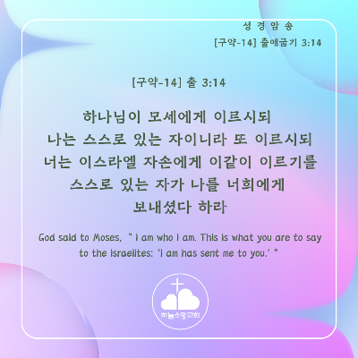 [ 구약- 14] 출 3:14 하나님이 모세에게 이르시되 나는 스스로 있는 자이니라 또 이르시되 너는 이스라엘 자손에게 이같이 이르기를 스스로 있는 자가 나를 너희에게 보내셨다 하라