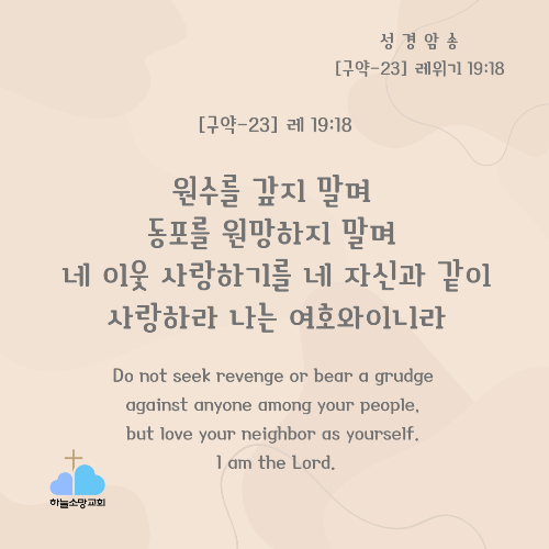 [구약-23] 레 19:18 원수를 갚지 말며 동포를 원망하지 말며 네 이웃 사랑하기를 네 자신과 같이 사랑하라 나는 여호와이니라