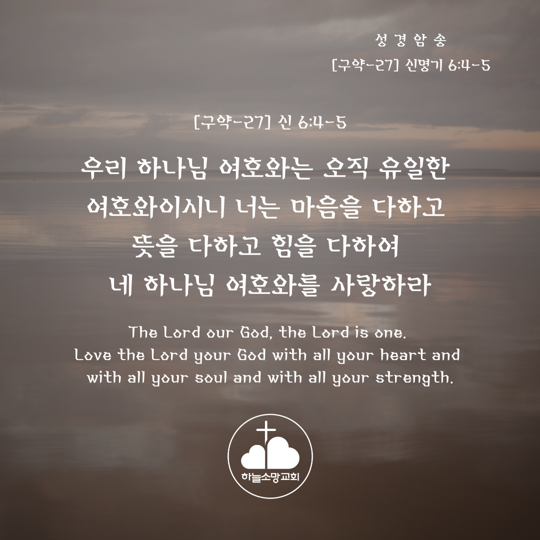 [구약-27] 신 6:4-5 우리 하나님 여호와는 오직 유일한 여호와이시니 너는 마음을 다하고 뜻을 다하고 힘을 다하여 네 하나님 여호와를 사랑하라