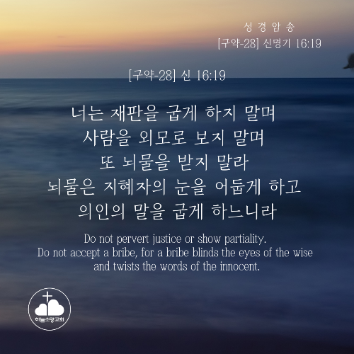 [구약-28] 신 16:19 너는 재판을 굽게 하지 말며 사람을 외모로 보지 말며 또 뇌물을 받지 말라 뇌물은 지혜자의 눈을 어둡게 하고 의인의 말을 굽게 하느니라