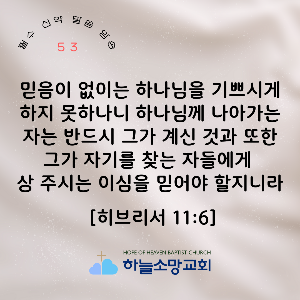 [신약 53] 히 11:6 믿음이 없이는 하나님을 기쁘시게 하지 못하나니 하나님께 나아가는 자는 반드시 그가 계신 것과 또한 그가 자기를 찾는 자들에게 상 주시는 이심을 믿어야 할지니라