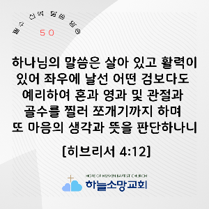 [신약 50] 히 4:12 하나님의 말씀은 살아 있고 활력이 있어 좌우에 날선 어떤 검보다도 예리하여 혼과 영과 및 관절과 골수를 찔러 쪼개기까지 하며 또 마음의 생각과 뜻을 판단하나니