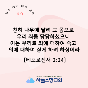 [신약 60] 벧전 2:24 친히 나무에 달려 그 몸으로 우리 죄를 담당하셨으니 이는 우리로 죄에 대하여 죽고 의에 대하여 살게 하려 하심이라 그가 채찍에 맞음으로 너희는 나음을 얻었나니