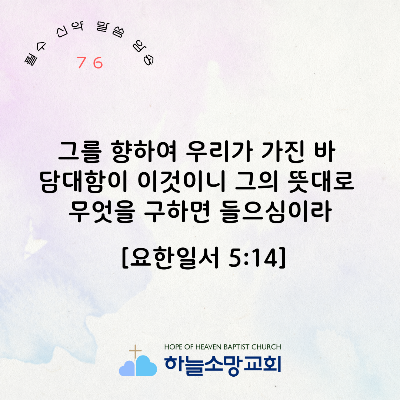 [신약 76] 요한일서 5:14 그를 향하여 우리가 가진 바 담대함이 이것이니 그의 뜻대로 무엇을 구하면 들으심이라