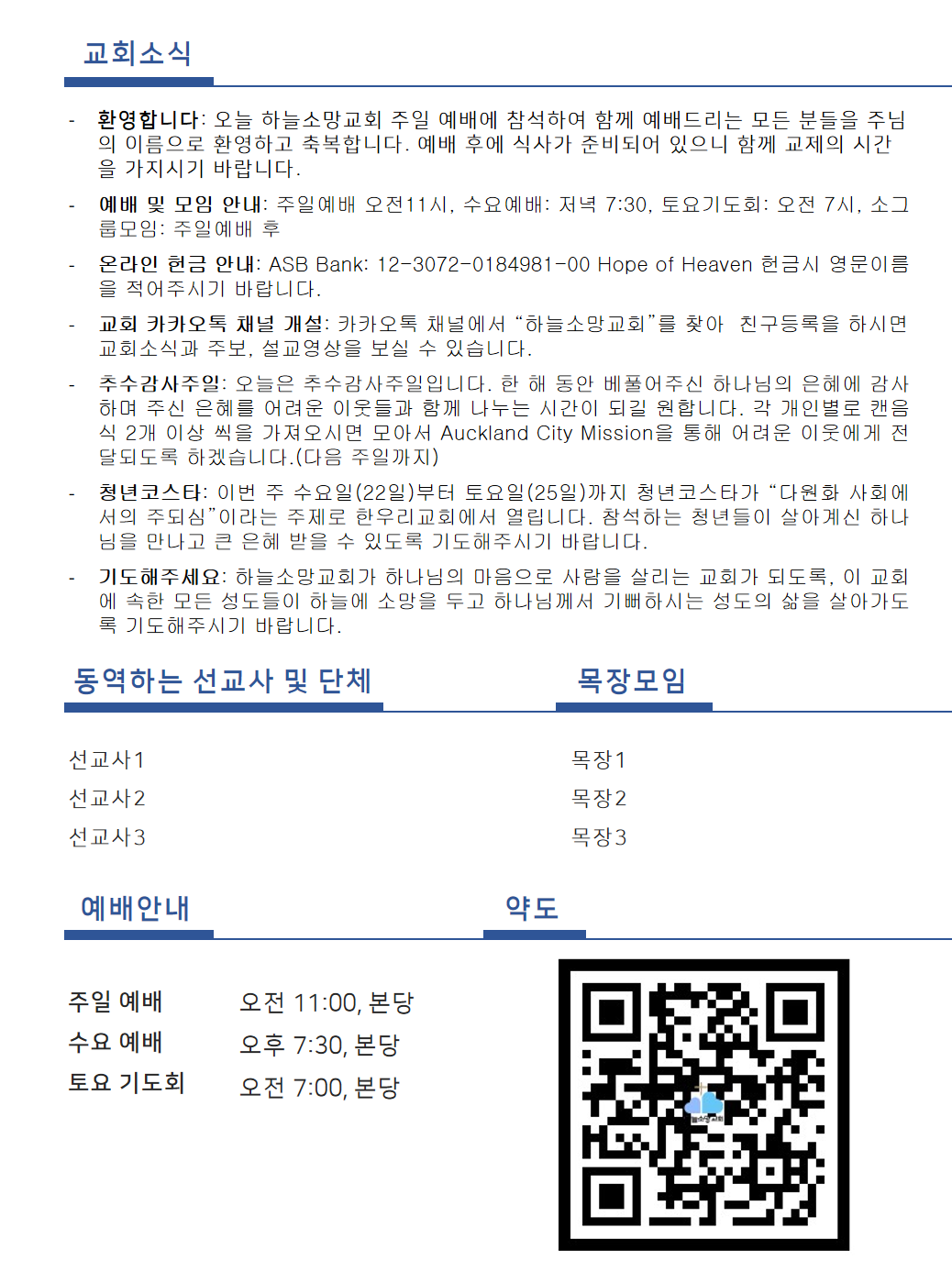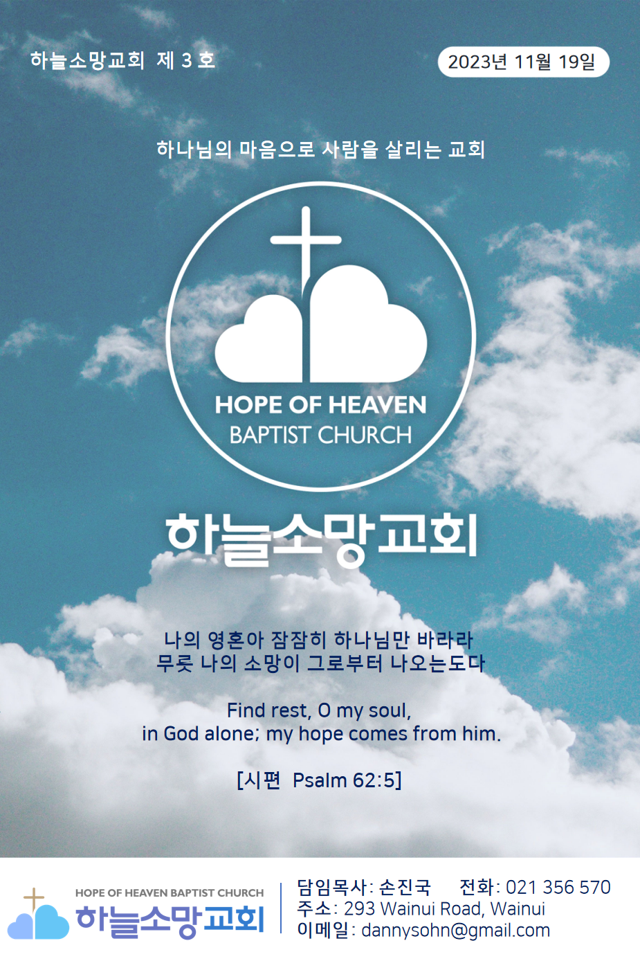 하늘소망교회(담임 손진국 목사)는 뉴질랜드 오클랜드 북부 실버데일에 세워진 한인교회로 '하나님의 마음으로 사람을 살리는 교회'입니다.