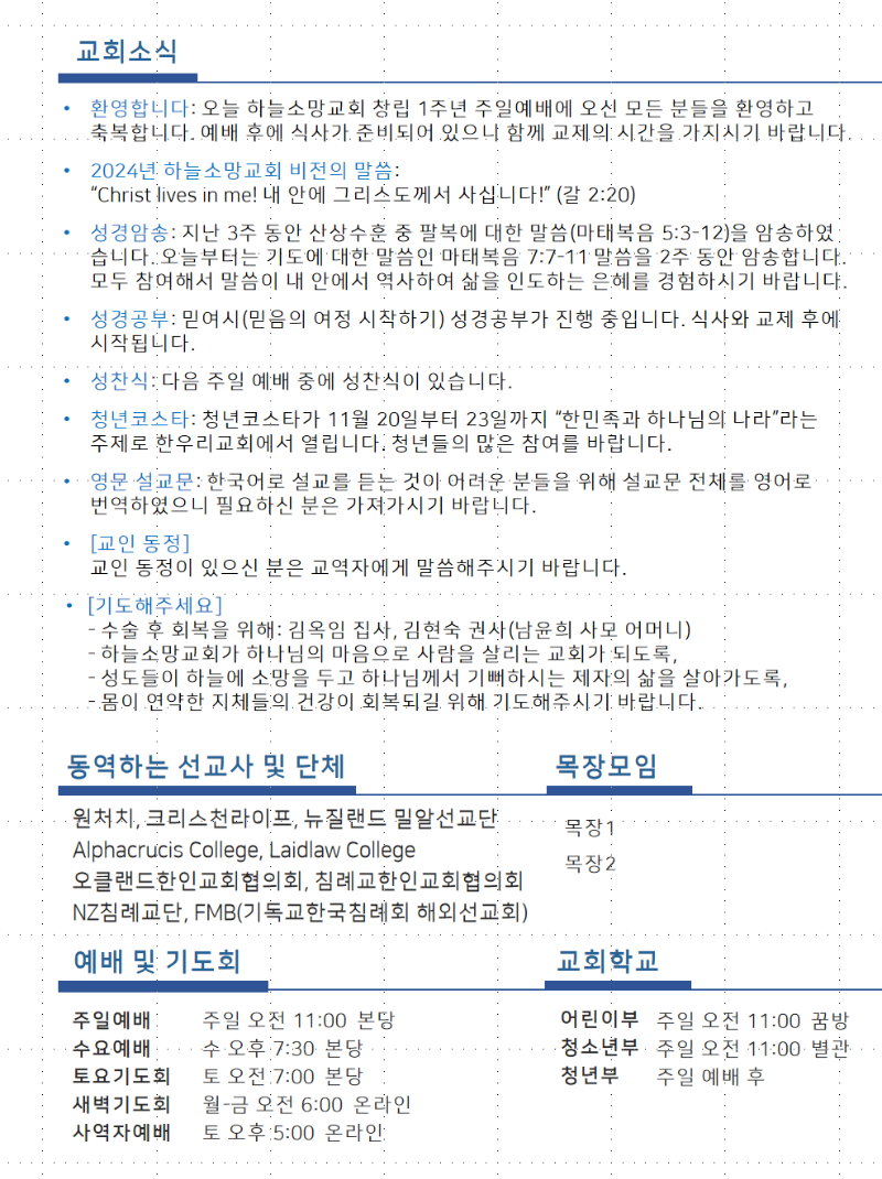 Hope of Heaven Baptist Church 하늘소망교회(담임 손진국 목사)는 뉴질랜드 오클랜드 북부 실버데일에 세워진 한인교회로 '하나님의 마음으로 사람을 살리는 교회'입니다.